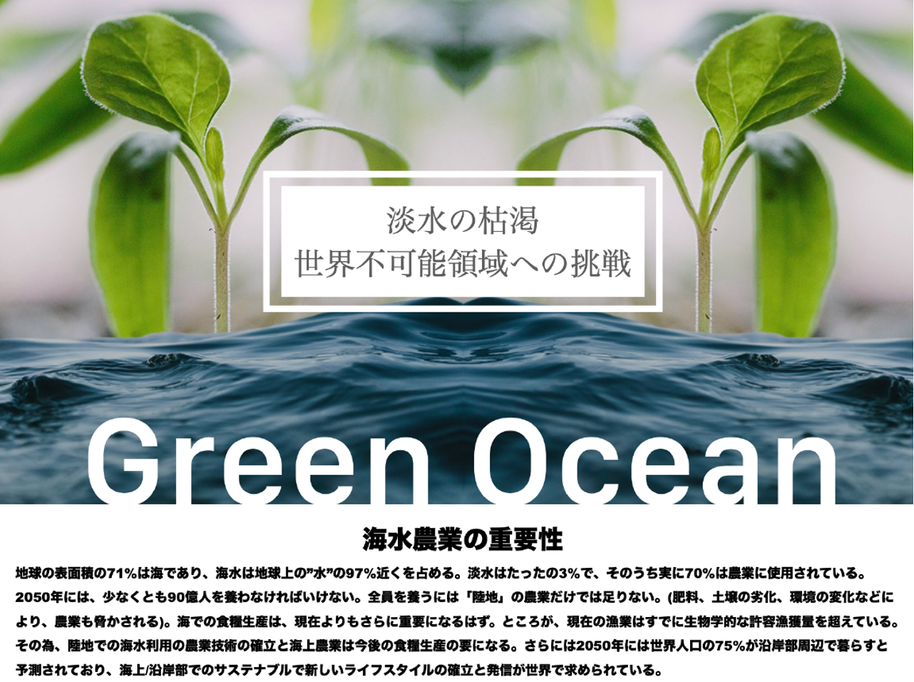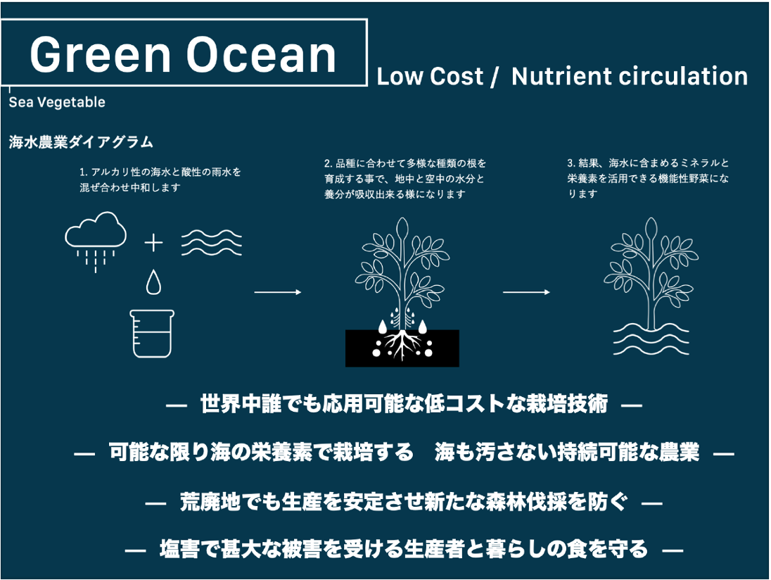 今回のプロジェクトは、私たちが開発している、高い海水希釈率で栽培する新たな「海水農業」に「太陽光エネルギー」を使うことで、気候変動時代の新しいサスティナブルな農業の形を世界に向けて発信、実現するプロジェクトです。