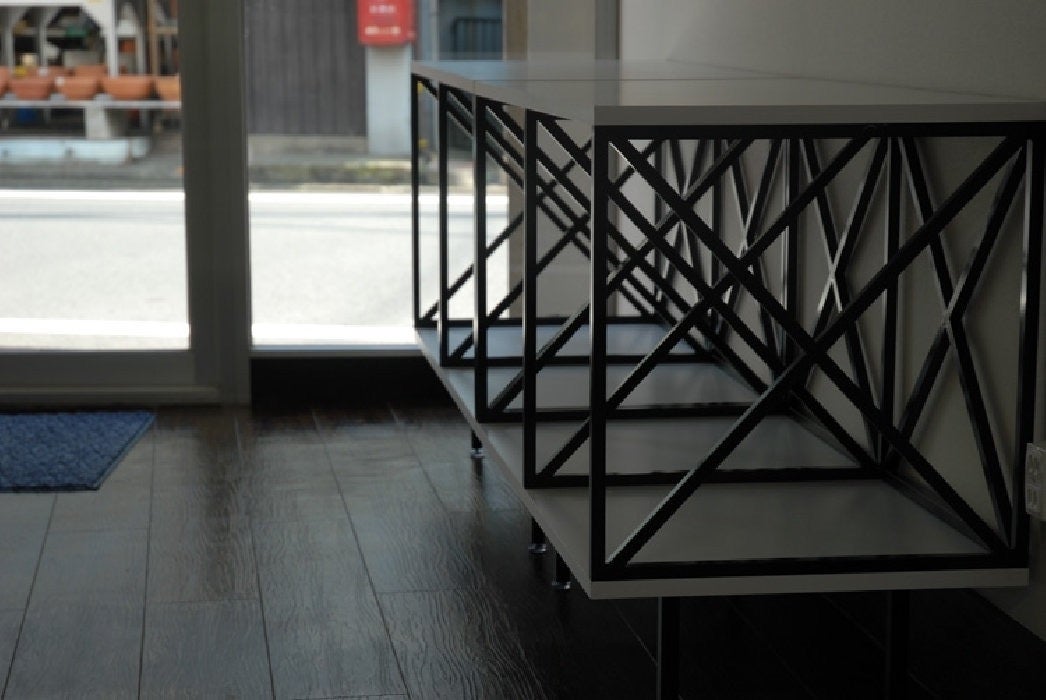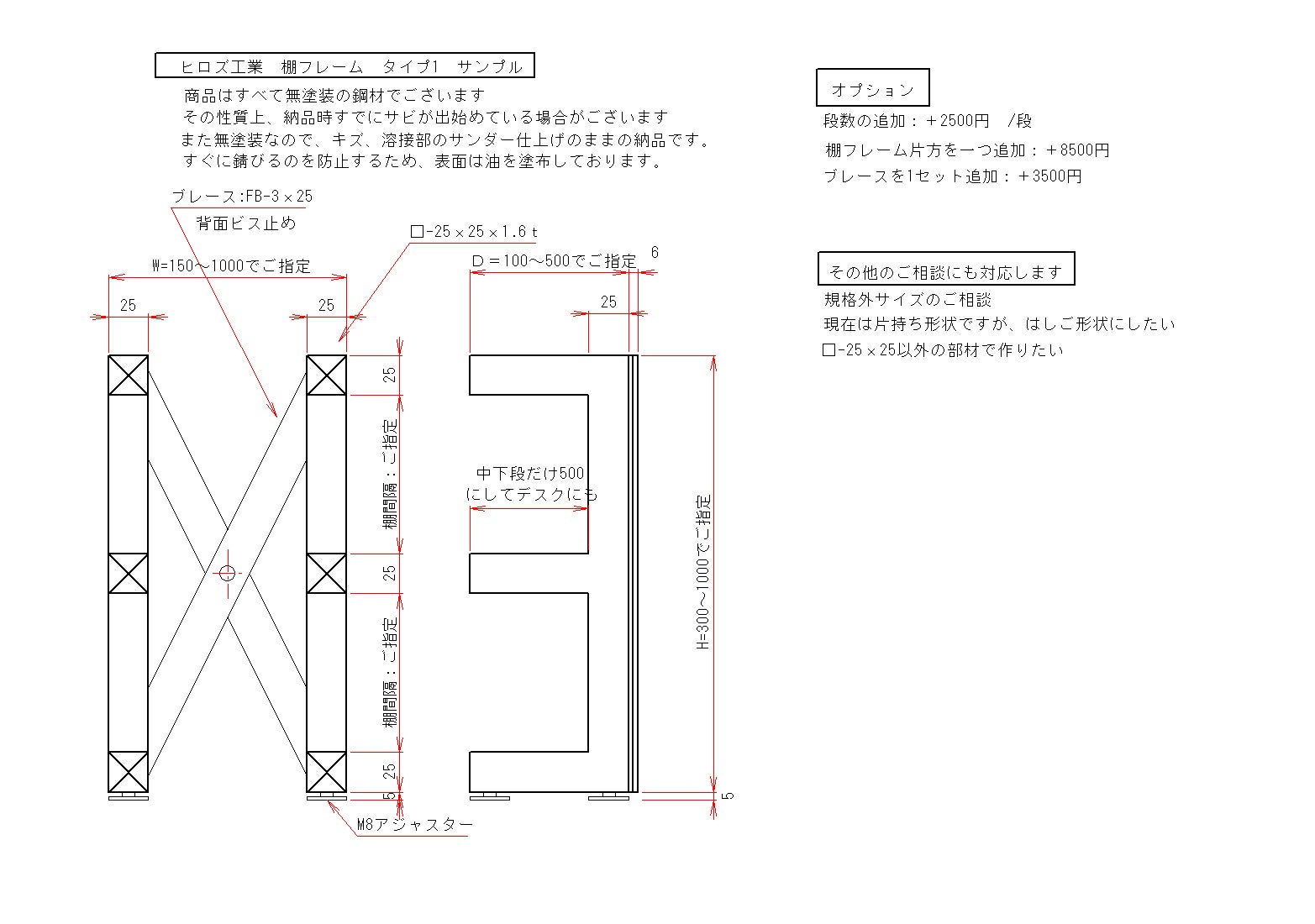 さしあたっての商品は、角パイプ(□-25×25)で製作した、縦横高さ自由、段数も自由な棚の鉄フレーム(無塗装)を製作致します。もちろんその他のご相談もお待ちしております。