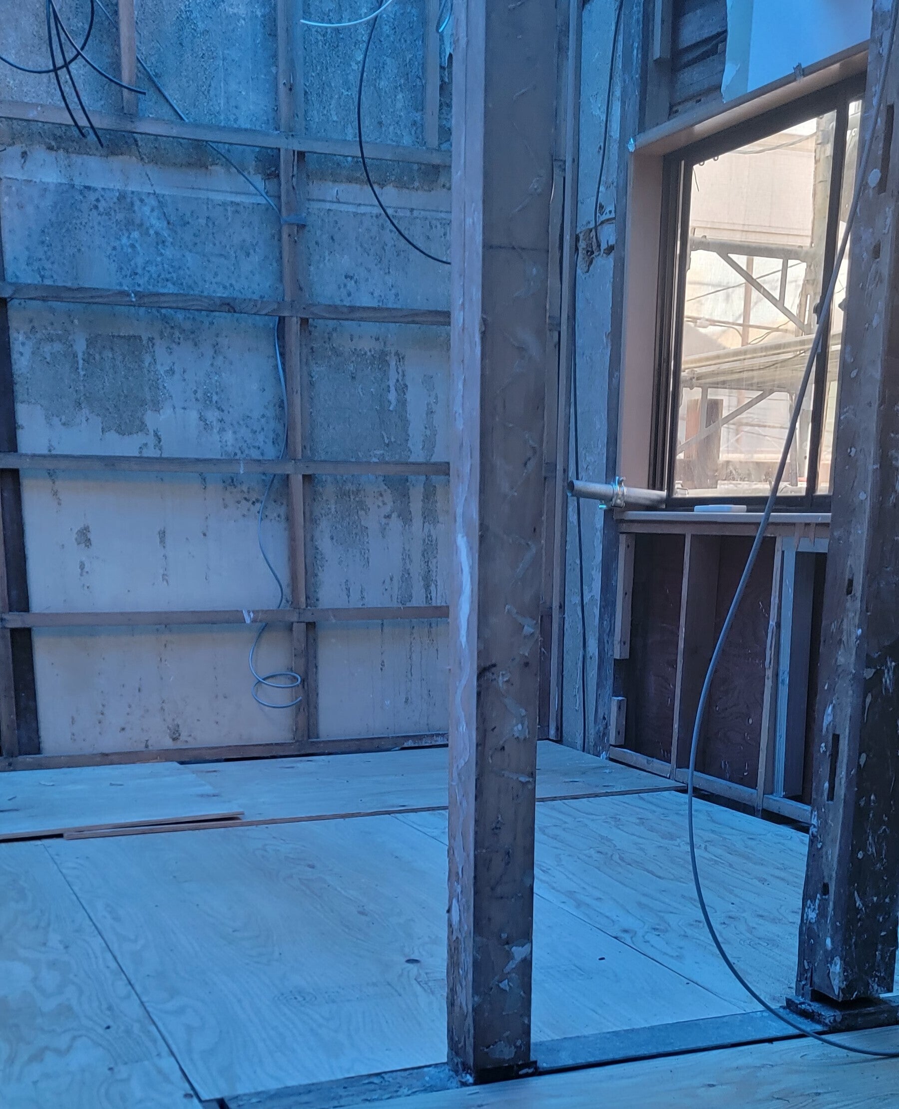 耐火ボードを設置するために一度壁紙や壁材、床材を取り除いています。