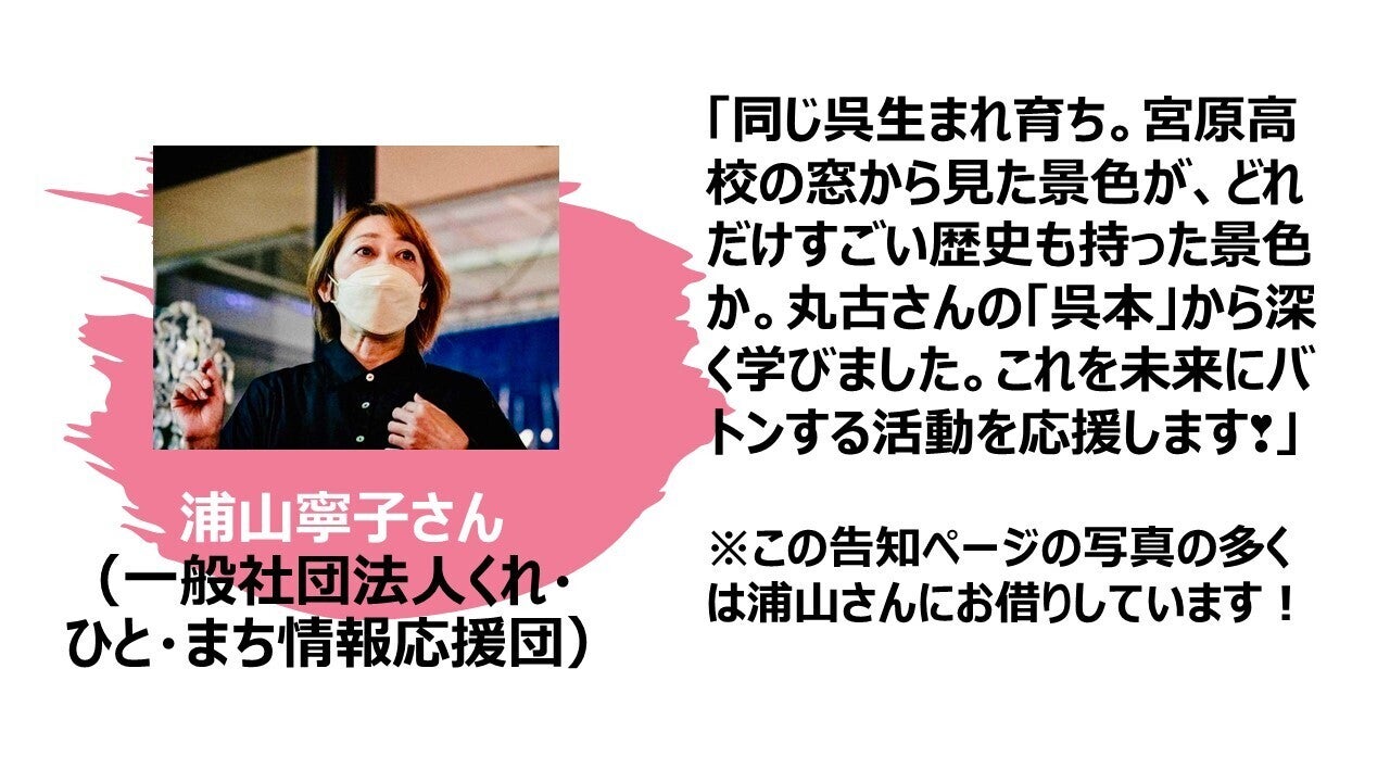 ※企画・運営は一般社団法人くれ・ひと・まち情報応援団。呉本に登場する呉市内の各所を徒歩でめぐります。所要時間2時間~2時間半。地元を知り尽くす方と丸古のWガイド。ゆっくりでも歩ける方ならご参加可能です!(過去のまち歩き実績はご参考ください。 ➡最新情報一般社団法人くれ・ひと・まち情報応援団 (https://kure-ouendan.org/)