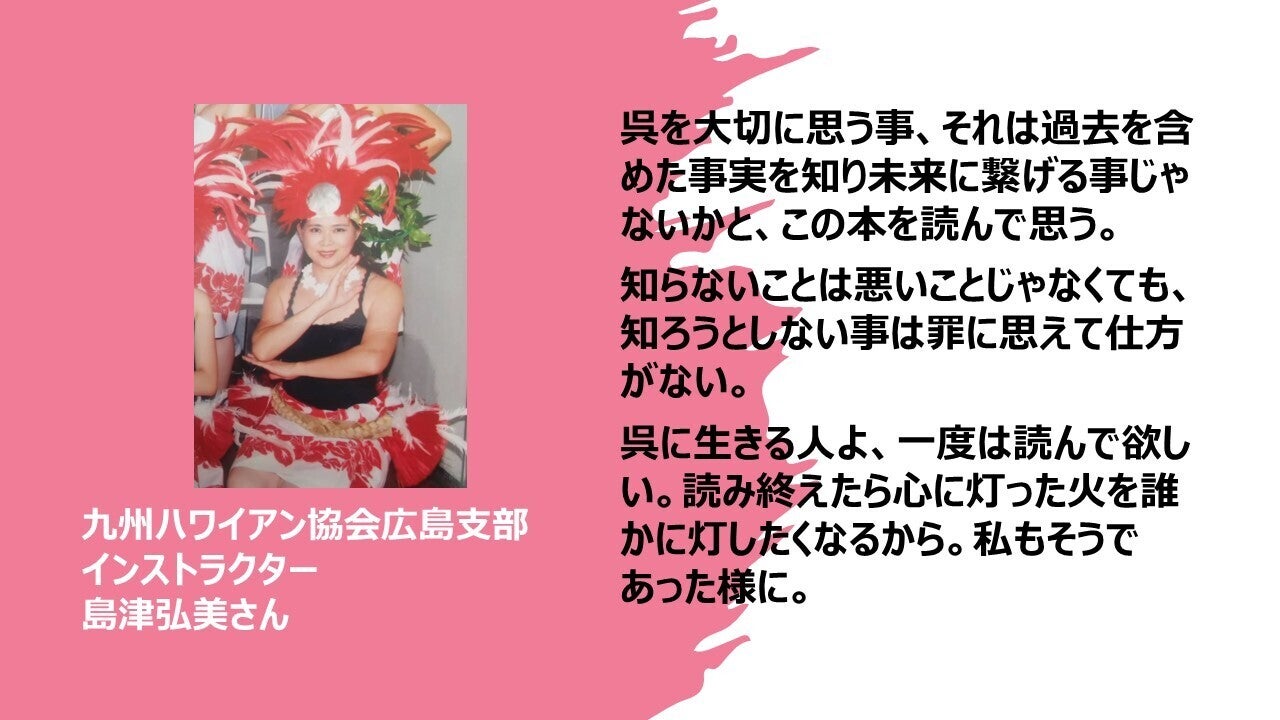 歴史は大の苦手です。ふるさとのこともほとんど知らない。でも、知れば知るほど、もっと知りたくなっていきました。「なにを知らなくて」「なにが不思議で」「どうやって知って」「だれに聞いて」「こんな風にショックを受けて」「切なくなって泣いて、笑って」と、呉を知ってゆくプロセスを大事に書きました。そのため、呉にさほど関心が無かった、歴史は難しくて嫌い、といった方々からも「おもしろく読めた」との感想をいただきました。