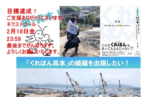 2022/02/13 13:57SUCCESS日時2022-02-09 17:47:14 管理画面ではこのような表示が確認できます。達成した日時です。みなさまのおかげさまで、本当に本当に大きなご支援により、目標達成することができました。ゆえに発刊へリアル発進しています。タイトルです。決めました。『呉本に ~自分と郷土史の浅からぬ縁。無くしたくないふるさとの声たち』「に」は、「2」です。「に」にあえて「2」とルビをふる感じ。デザイナーさんにアイデアをいただき、うんうん考え、練りに練りました。初代『呉本』では、ふるさとのことを知りたいわたしの欲望に、多くの方が応えてくださり、戦争体験、学徒動員体験をはじめ、戦艦大和のこと、造船史のこと、亀山神社のこと、果ては海上自衛隊まで、「知らなかったことを知る」旅をしました。 続く『呉本に』は、『呉本』あってこその広がりでした。初代が艦艇の海とすれば、「飛行機の空」に触れていきます。呉にも航空廠があったこと、そこでの学徒動員経験、特攻志願、特攻隊のことを考え、また、自分と郷土史がつながっている経験もした。(沖縄戦の大田實海軍中将の息子が自分の高校の恩師だった)そして、掃海隊群司令と、大和ミュージアム館長のロングインタビュー。なんといいますか・・・。つづきの「続」ではおさまらない広がりで(自画自賛ですみません・・・)、たしかに位置づけは「2」だけど、数字の「2」でこの広がりは表しにくい。呉本「に」、「2」であり、「助詞のに」の雰囲気もあって。やわらかく、やさしく(優しいと、易しい)、どなたにでも。初代をご存知ない方も、「に」だから手に取りやすいかな。サブタイトルは、初代のテイスト(海軍、空襲、大和など名詞を連ねる)ではなく、このたび新しくやってみて、郷土の歴史というのは、自分とつながっているんだと。遠い史実や他人事ではないんだなと。「残したい」「遺したい」とはよくいうけれど、わたしにはおこがましい。「無くしたくない」のほうがふさわしいと。(サブタイトルはわたし自身でつくりましたよ!)広島県呉市を探っている本ではありますが、ふとした疑問から「え?自分のふるさとってなに?」とはじめられる、どの土地にも当てはまる、「じゃあ自分のふるさと見てみるか」のサンプルにもしてもらいたいなとも思います。 もっと見る「カタチになっていく」ことの実感。