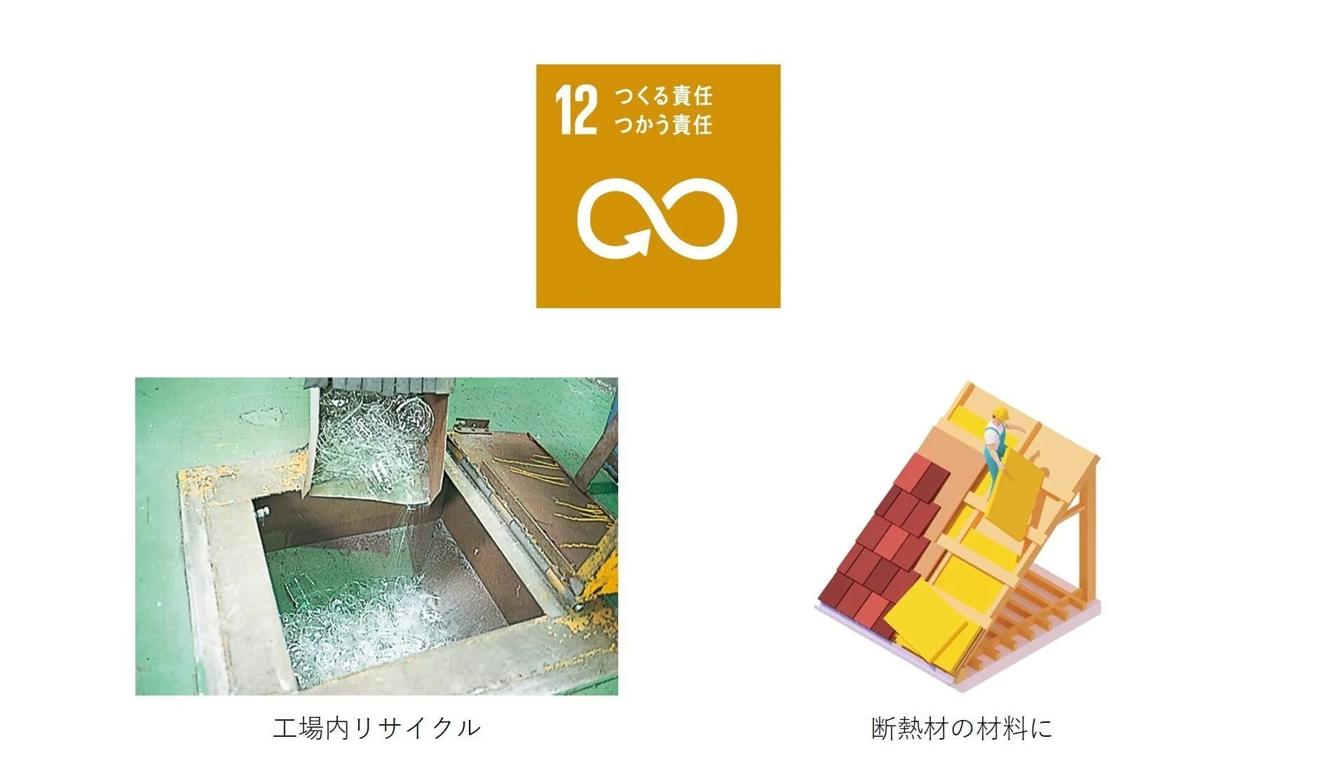 また、プリントを付けたガラスで最終製品とならなかったものは、グラスウール(断熱材)メーカーの材料として再利用。
