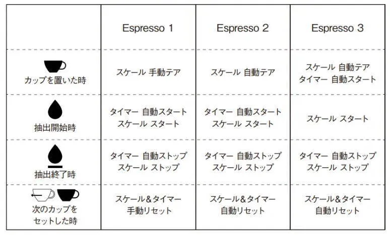 エスプレッソマシンで繰り返し抽出記録を取り続けることができます。オペレーションに合わせて、テアの仕方、タイマーリセットの自動/手動を下記の3つの記録方法を選択できます。