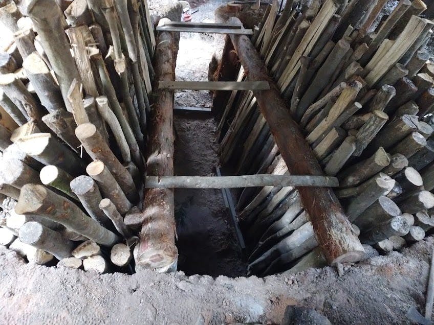 先日天井が抜けてしまった炭窯の修理が始まりました。まずは木を炭窯の中にぎっしり立てていきます。これは天井を支える土台となるものです。最終的に炭窯がドーム状になるように、長さの異なる木を並べていきます。これから少しずつ修理の仮定を活動報告及びTwitterにアップしていく予定です。中から見た様子。