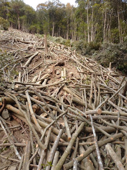 見渡す限りの樫の原木。樫は切り立った崖っぷちに生えていることが多いので切るのも集材も大変です。最初のころは崖山に登るのも一苦労でしたが今はいくら登っても息が切れることがありません。樫は大体15~20年位で炭焼きに適した成木になります。