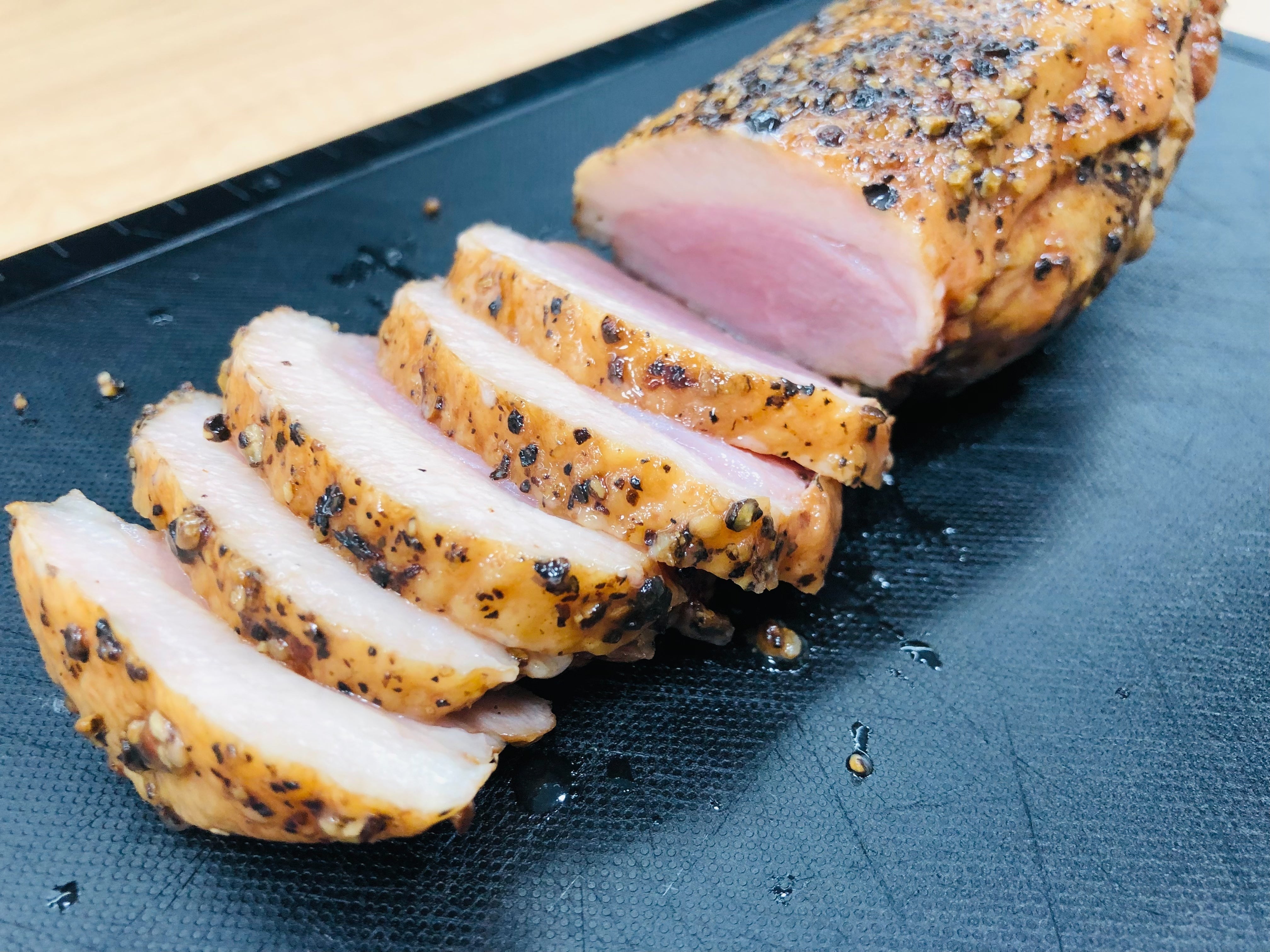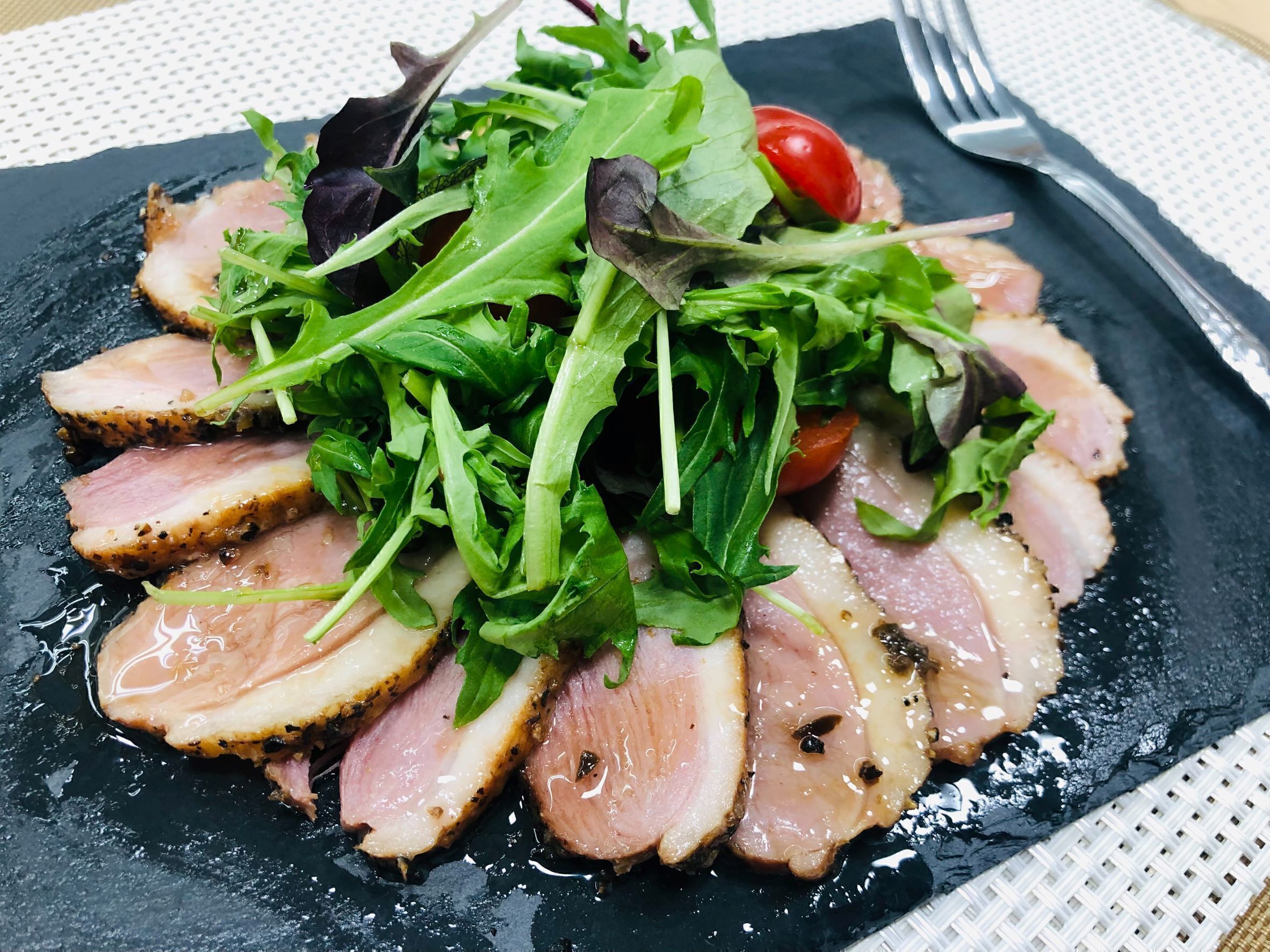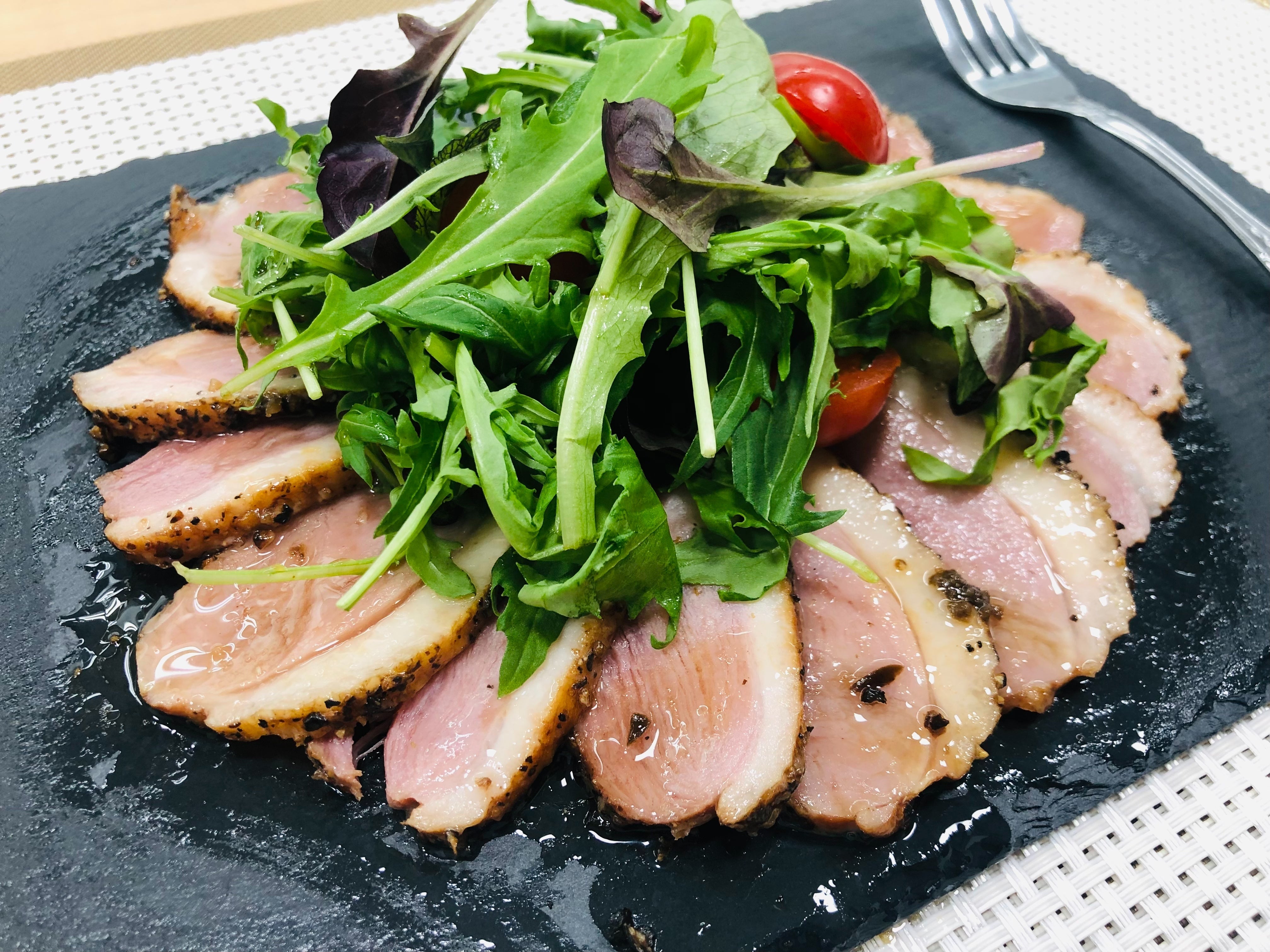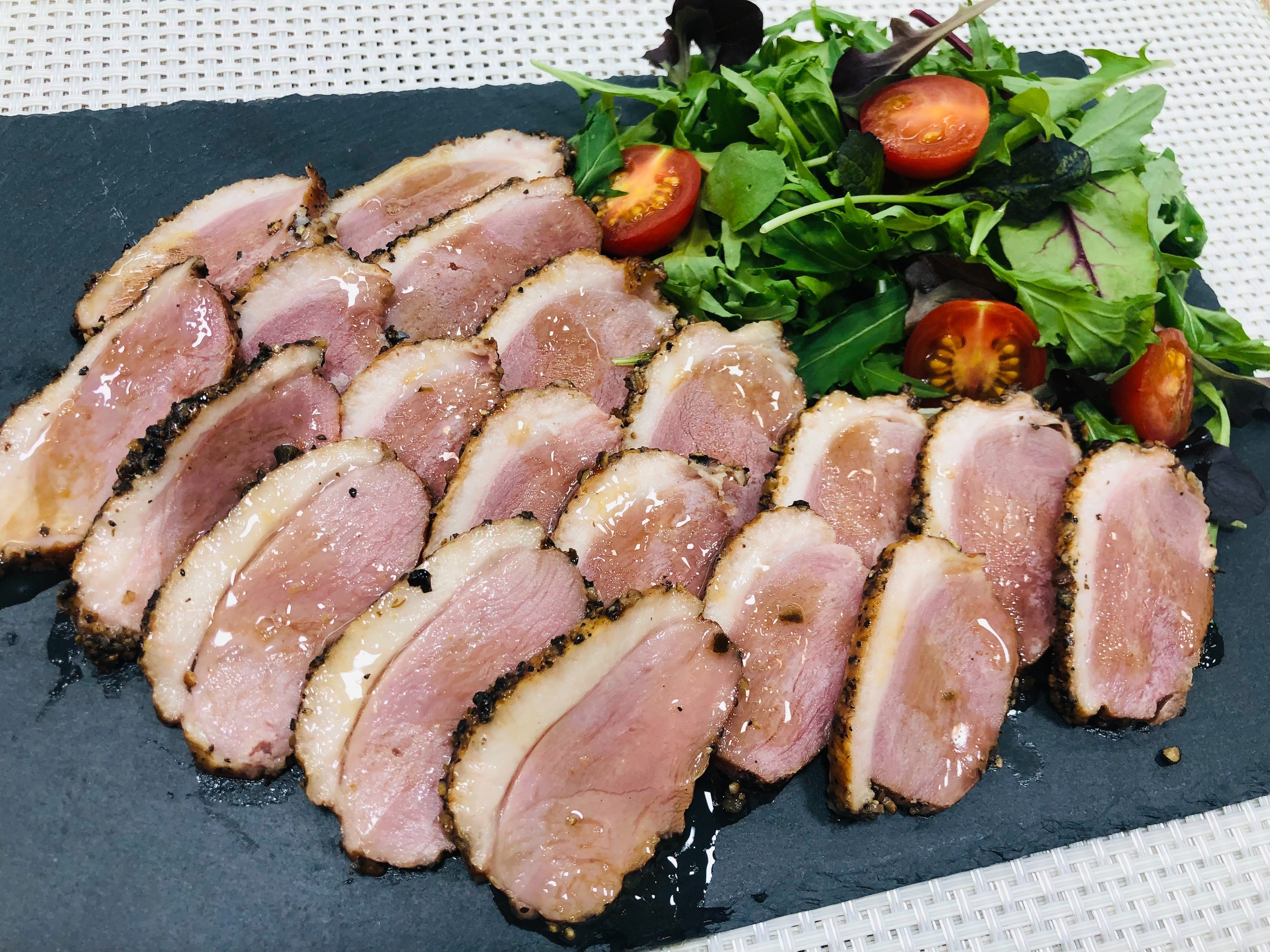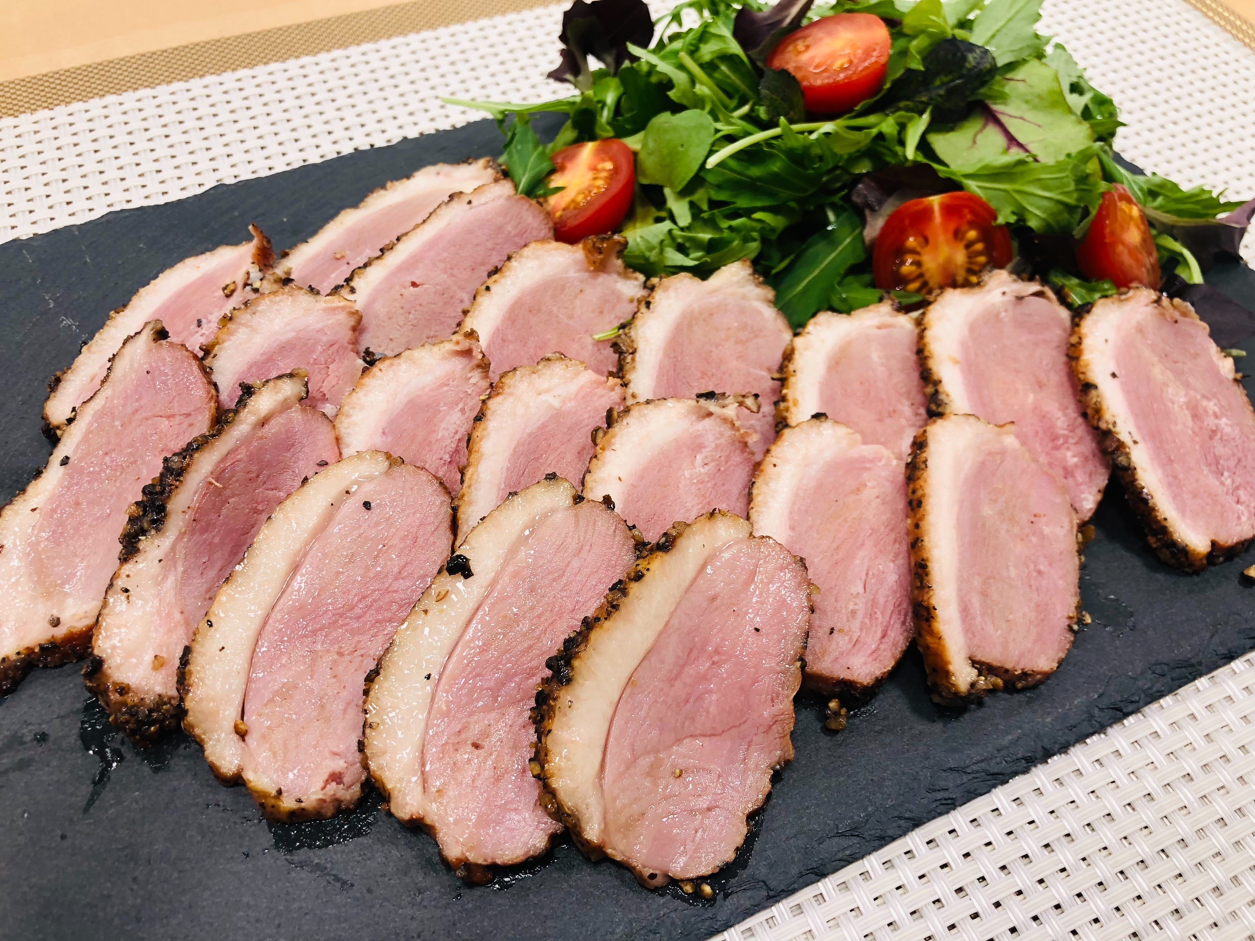 合鴨ロース肉を果物のチップでじっくりスモークし、粗挽き胡椒をまぶしました。肉質は柔らかくジューシーでスパイシーな商品です。サラダのトッピングにしても良し、そのままお酒のおつまみにしても良しと万能な商品です。