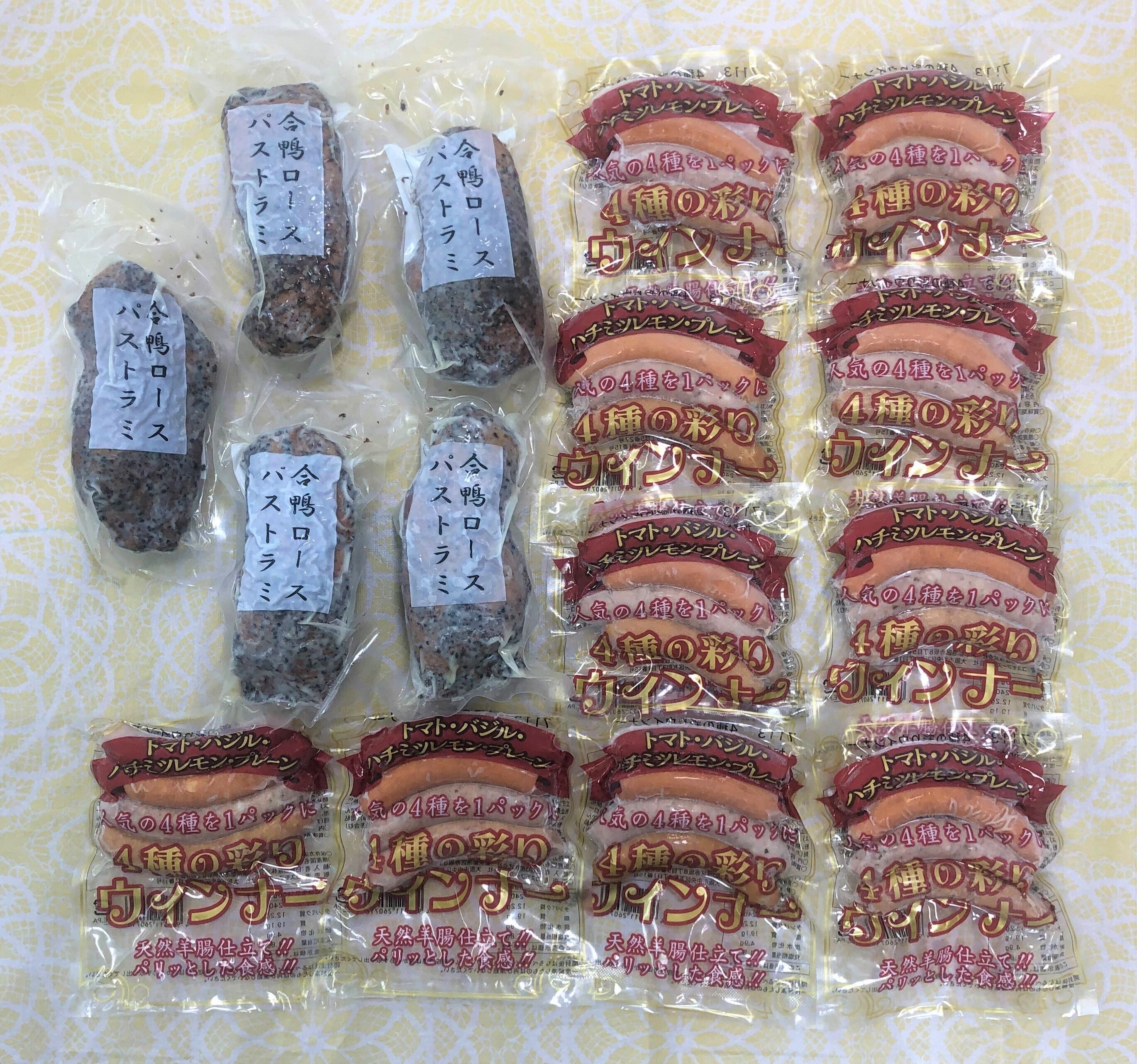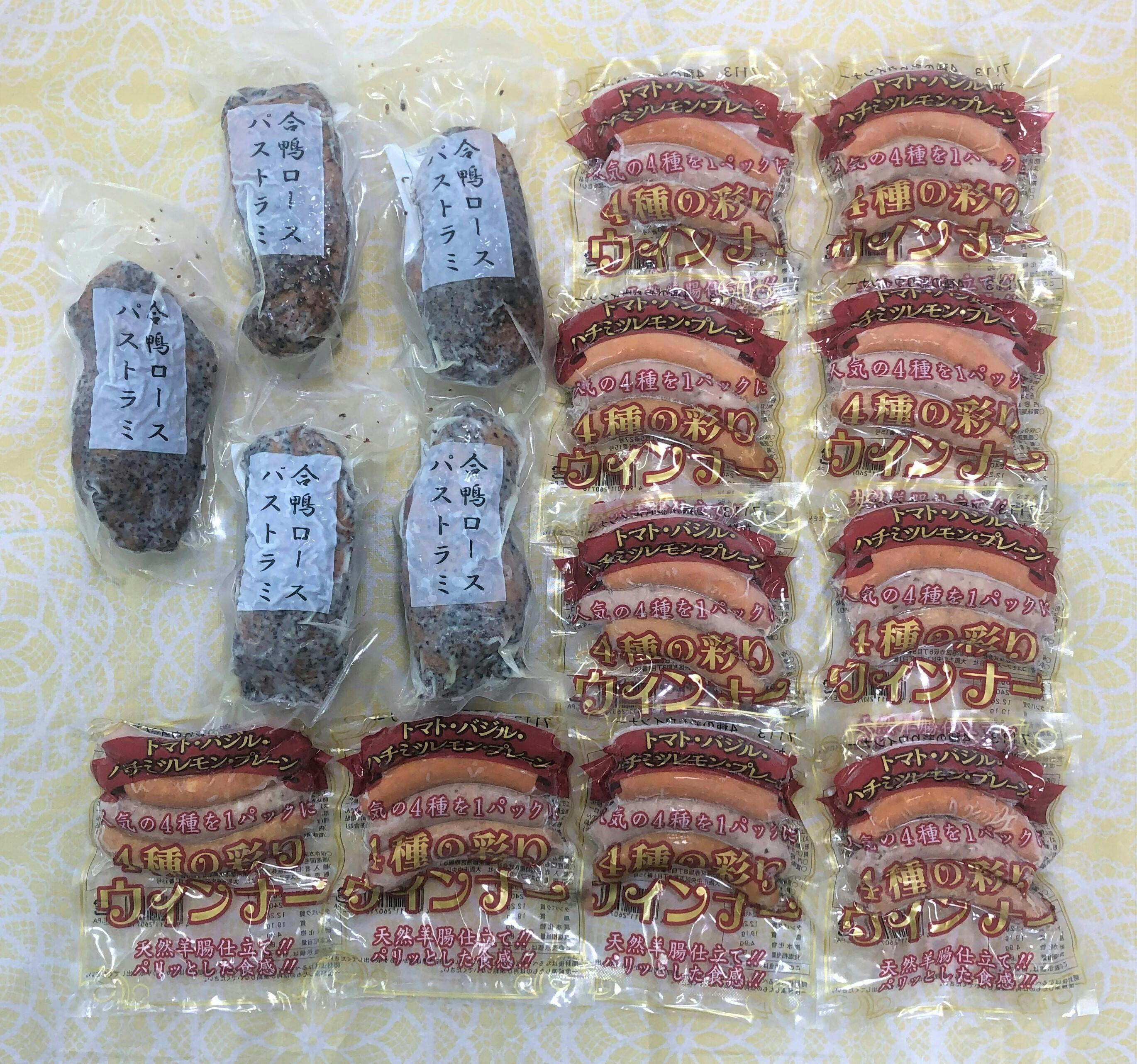 → 4種の彩りウインナー 1㎏(100g×10p)、合鴨ロースパストラミ 1㎏(200g×5本)