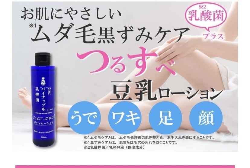サポーターの皆様、こんばんは!今回、ご紹介するのはムダ毛ケア後の毛穴を整えて、また毛穴に働きかける全身用化粧水です。カミソリなどで除毛、脱毛した後ってお肌のストレスは大変なものです。鳥肌のようになってる状態のままでは、黒ずみなどの原因になってしまいます。今回ご紹介するラクトドロップボディローションは、脱毛クリニックでも施術後に推奨される【豆乳ローション】がベースとなっています。大豆イソフラボンが毛穴をしっかりケアしてくれます。この豆乳ローションにパイナップルエキス、パパインエキスなどを配合!ムダ毛の処理をより簡単に!さらにさらに【美肌菌】を整えてくれる乳酸菌を配合。肌体力をアップさせて本来のうるおい肌に。勿論化粧水ですのでお顔にも使用できます。これ一本でお風呂上がりなどにご使用で全身保湿でつるすべ肌に!是非ご検討ください。