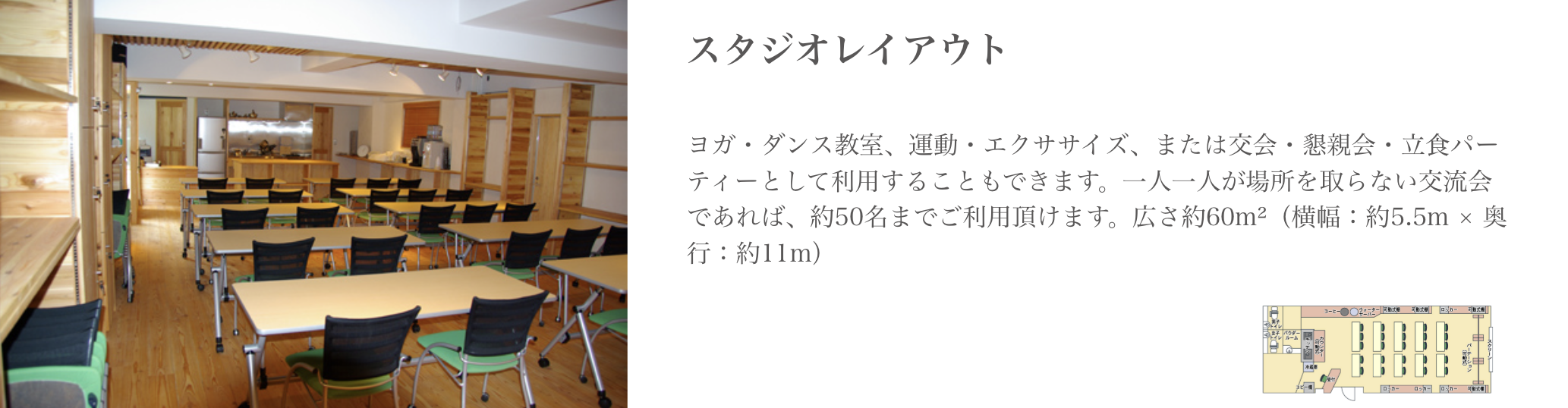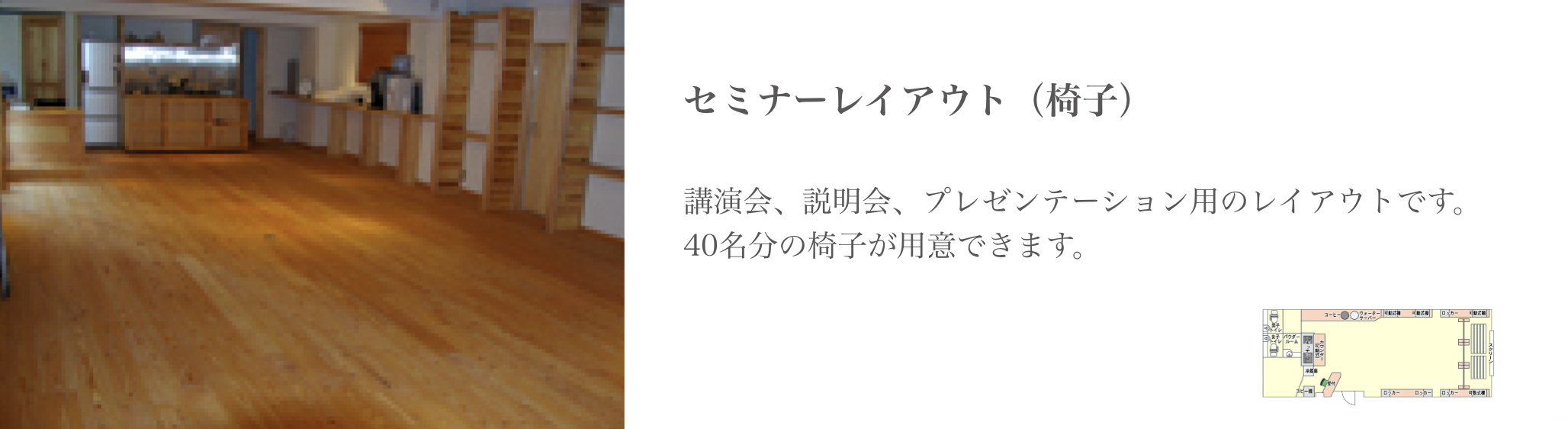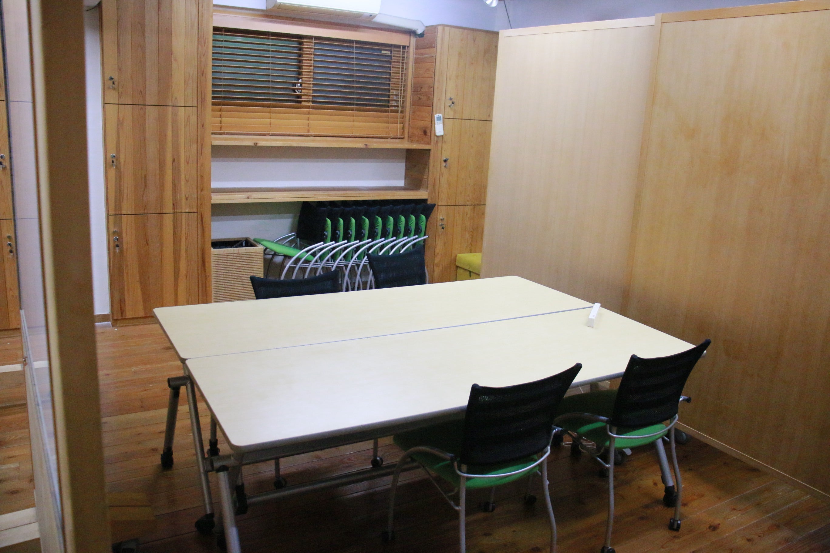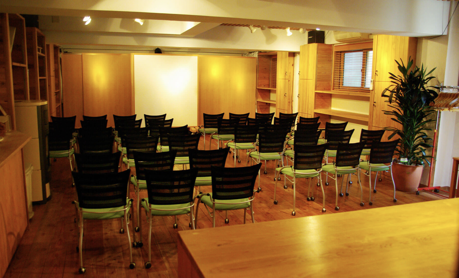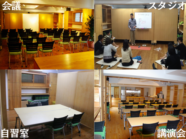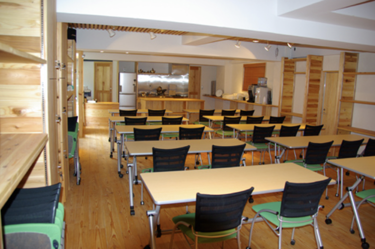 吉田自身が北海道の地で経験した自然からの癒しを再現したいと、自然素材をふんだんに使用して、「会議室」感のない温かみのある癒しの空間を創り上げました。夜は12時まで使用できるという最大50人収容のスペースは、イスが壁面に収納できるようになっており、会議やセミナーはもちろん、ダンス教室など様々な趣向の催しにも最適な場となっております。キッチンが併設されているので、立食パーティーや懇親会等のイベントも行う事もできます。「ここに来ると仕事がはかどる」「リフレッシュして頭がすっきりする」との声が寄せられ、好評となっております。