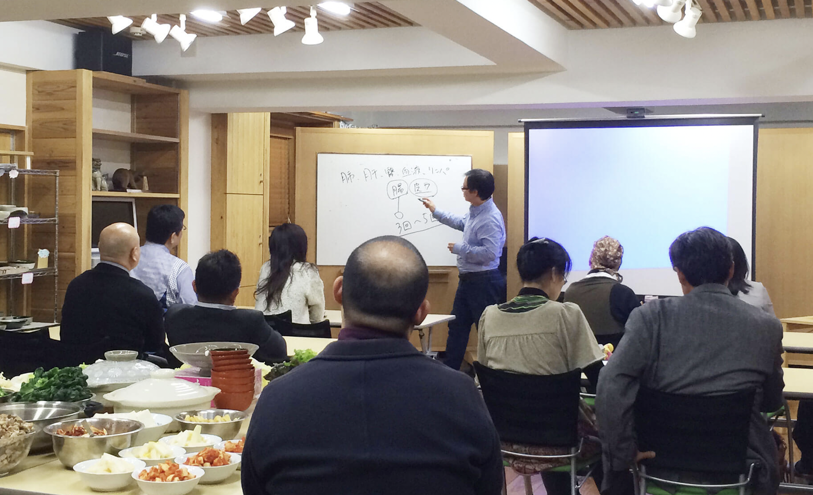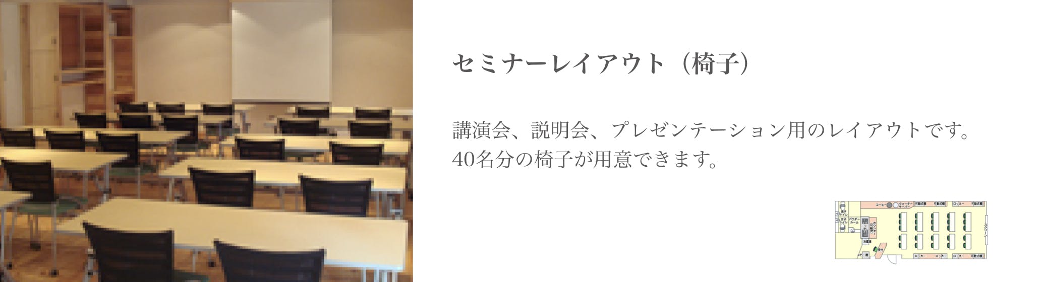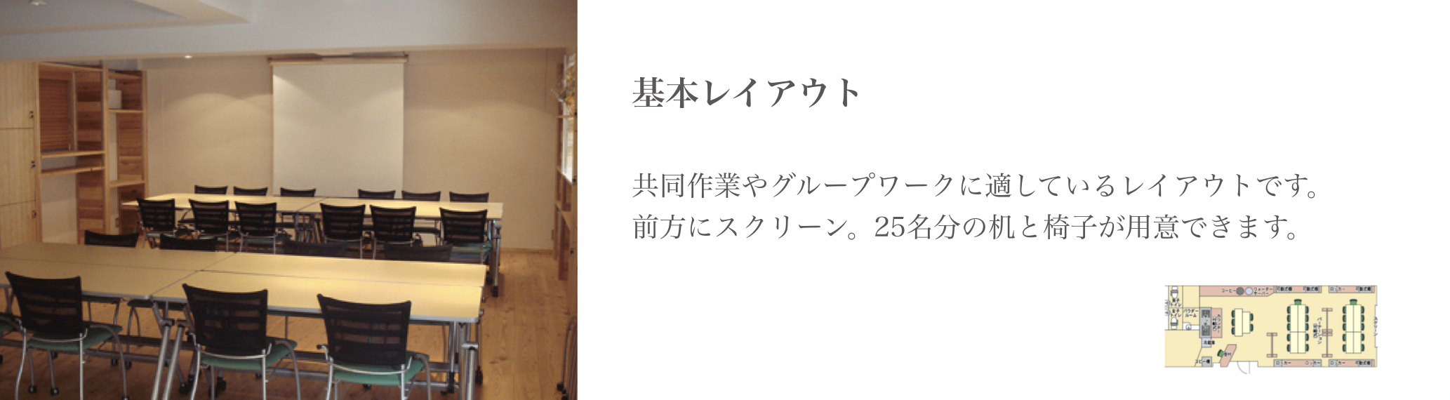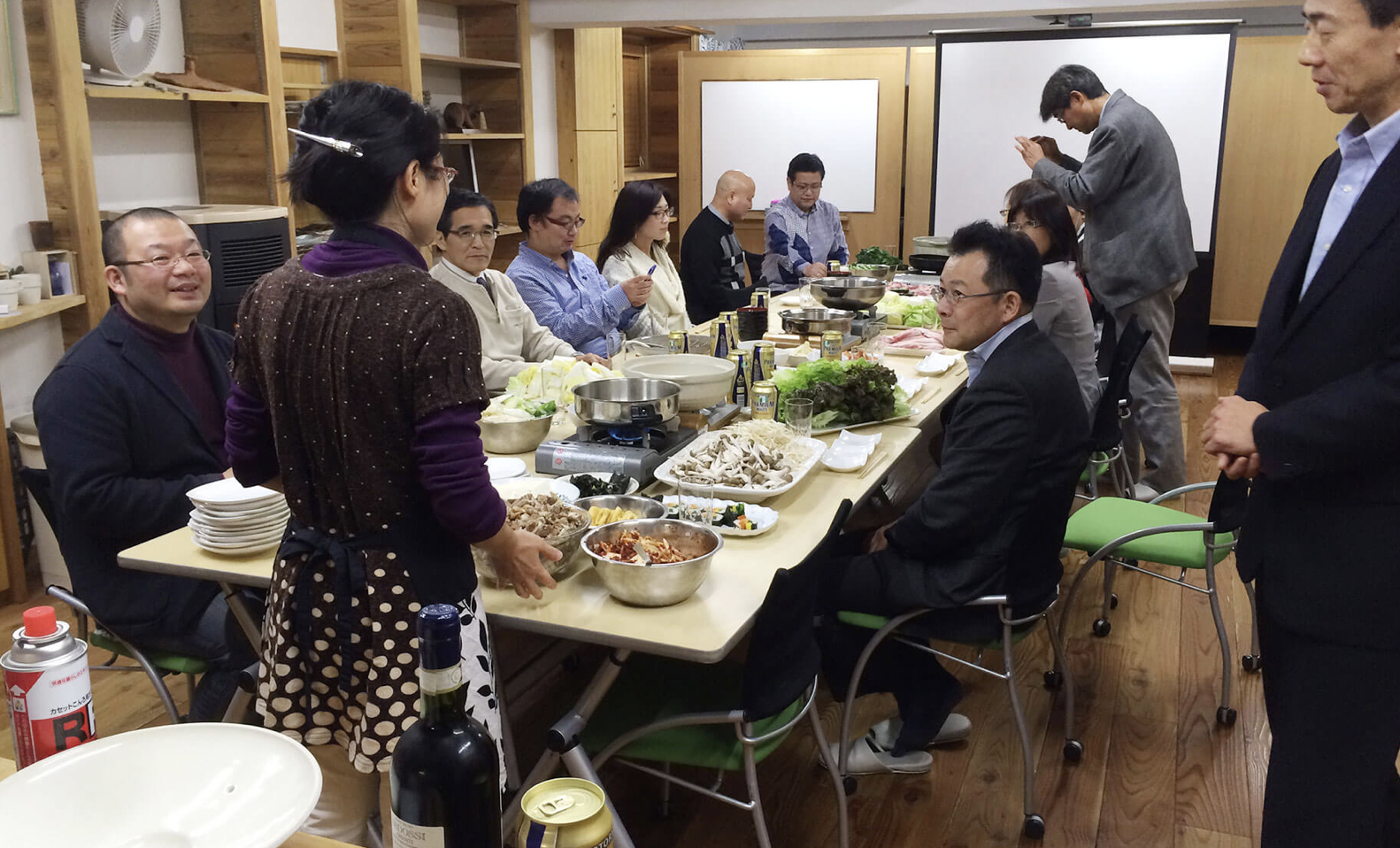 吉田自身が北海道の地で経験した自然からの癒しを再現したいと、自然素材をふんだんに使用して、「会議室」感のない温かみのある癒しの空間を創り上げました。夜は12時まで使用できるという最大50人収容のスペースは、イスが壁面に収納できるようになっており、会議やセミナーはもちろん、ダンス教室など様々な趣向の催しにも最適な場となっております。キッチンが併設されているので、立食パーティーや懇親会等のイベントも行う事もできます。「ここに来ると仕事がはかどる」「リフレッシュして頭がすっきりする」との声が寄せられ、好評となっております。