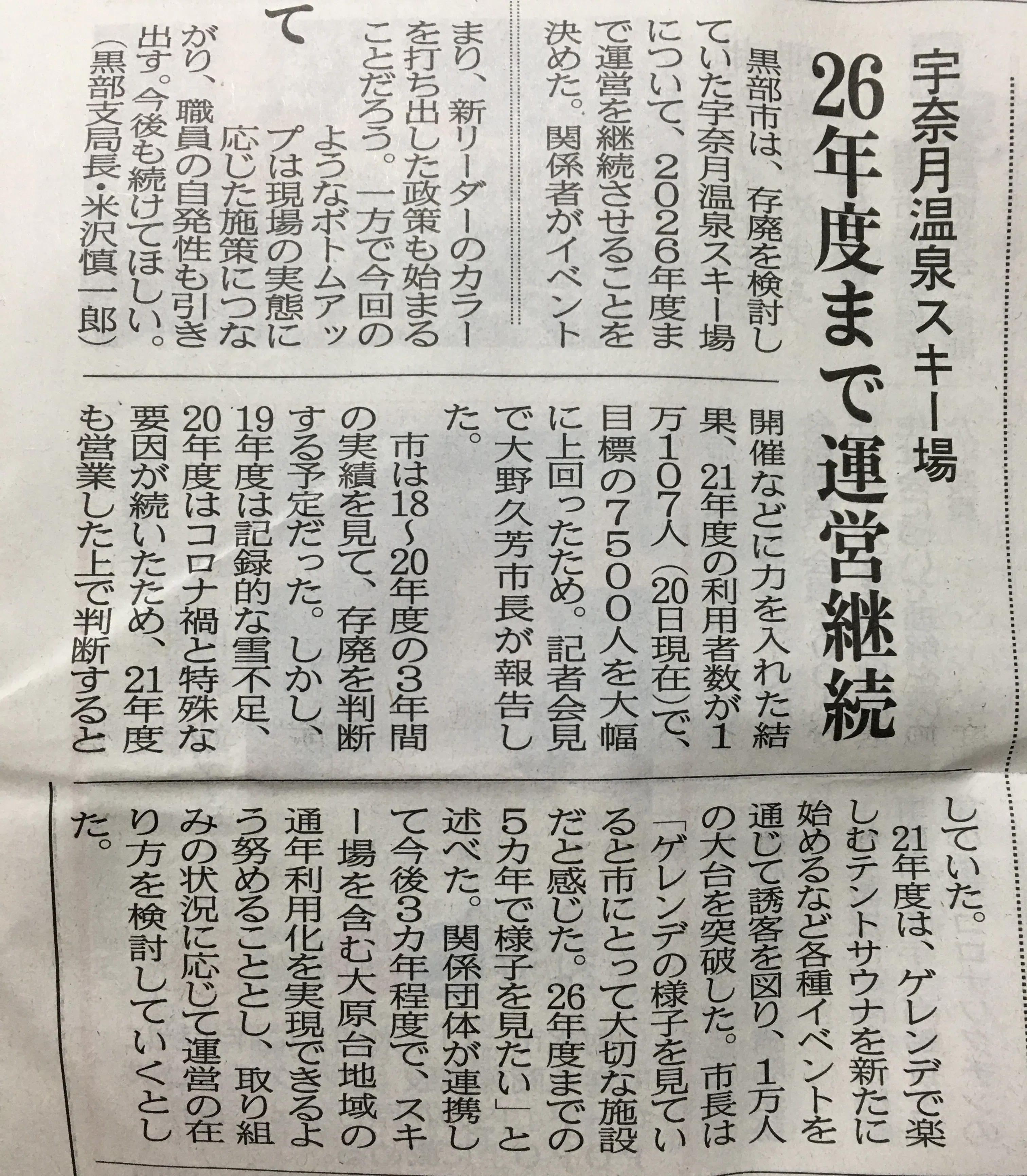 2022/02/22 09:54皆さんこんにちは、ウナジョこと津田なゆこです♡こちら本日の北日本新聞の記事です。宇奈月温泉スキー場、向こう5年存続決定となりました!!!!!!!この記事を読んで、ウナジョのおかげだ!とかウナジョすごい!とか言われますが、全くそんなことはありません、本当に。私個人はひたすらウナジョ喫茶を毎年淡々と続けて、テントサウナの運営もお任せしちゃってるし、グルメイベントも声かけてるけど皆さん快諾してくださるおかげだし、アクティビティーイベントもほとんどお任せしていて、皆さんのおかげです。私1人で出来ることなんてせいぜいカフェ運営するくらいで(それすらも最近ワンオペに限界がきている)、このクラファンで支援していただいた方々、スキー場に足を運んでくださる方々、YouTubeやインスタ等SNSでイイネいっぱい押してくださる方々、リツイートしてくださる方々、皆さんの応援やご支援がこうやって形になって5年の存続が決定しました。本当にありがとうございます✌︎('ω'✌︎ )今年は新しい試みを沢山取り組むことが出来ました。『ウィンタースポーツ』といってもスキー、スノボだけではありません。令和の時代です。スノーシューや雪板、スノーストライダー、スノーフラッグ、雪上サッセン、広い意味での【雪遊び】が出来るスキー場であってほしいし、なかなか他のスキー場でやらしてあたらんけど、それは宇奈月温泉スキー場なら出来るよね、そんなスキー場であってほしいです。賛否両論あるとは思いますが、何を言いたいかというとスキー場を色んな目的を持った方に使っていただきたいと思ってます(私が勝手に思ってるだけです笑)この先何年たっても、皆さんの心の片隅に住めるようなスキー場でありますように♡PS.ただ今急ピッチで皆さんの返礼品を準備しております!ウナジョひとりでやってますのでもうしばらくお時間いただけると幸いです。ご理解ご了承の程お願い致します! もっと見る