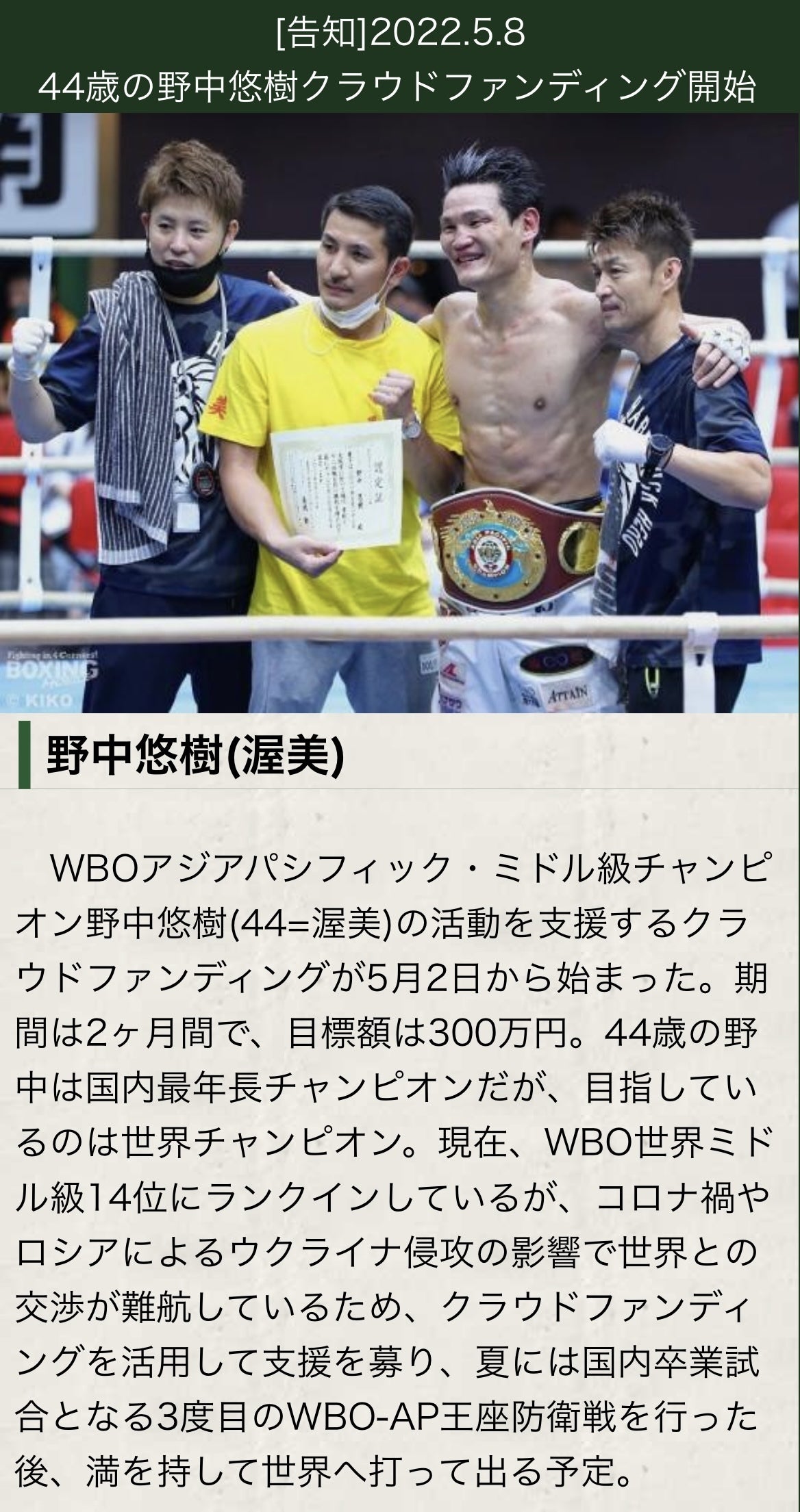この度、「44歳の国内最年長王者の最後に世界ミドル級タイトルマッチのチャンスを」のプロジェクトへご支援、ご賛同頂いた皆様へ感謝申し上げます。本当に有難い事に目標金額の88%となる「264万2000円」もの支援が集まりました。(どれぐらい賛同が得られるのか…)(全く集まらなくて野中さんのキャリアに傷をつけるような事にはならないか…)正直色々な不安がある中でこのプロジェクトを立ち上げたのですが、終わってみれば151人もの方達が支援して下さって、皆様からの応援コメントが届く度に「必ず世界まで辿り着いてやる」という思いが強くなっていきました。色々調べてみた所、現役ボクサーとしては世界王者の京口紘人選手の「177万3000円」がクラウドファンディング史上最高額だったのですが、それを大幅に上回る事が出来ました。起案者の自分自身ですらこの2ヶ月間で成長出来たと思いますし、クラウドファンディングを通じてチームの絆が深まっていった事を実感しています。全員世界王座を獲る覚悟で本気でやっているメンバーなので、クラウドファンディング挑戦も一致団結出来たように思います。2021年7月23日の2度目の防衛戦の時に野中さんと桂トレーナーが自分を再びボクシング界に戻してくれたのですが、その時にクラウドファンディングを立ち上げようと決心しました。同年12月に桂トレーナーと具体的にクラウドファンディングについて話し合いました。あの日は会うの久々で4時間ぐらい話してました(笑)独学で英語覚えて海外の大手プロモーターと直接やり取りするまでになった凄い人なので、自分も聞くのが楽しくてついつい色々質問してしまうんですよね(笑)年が明けてから野中さんとは何回も練習終わりのジムやファミレスとかで打ち合わせ。その時は、桂トレーナーがいくつか海外プロモーターと交渉している時で、これが無理だった場合は国内で3度目の防衛戦を決断するという状況でした。その国内の試合もどこのジムのいつの興行に出るかは海外プロモーターとの交渉結果次第だったので、常に天秤に懸けながら慎重に判断せねばなりませんでした。前もって準備はしていたので、7月24日の興行に出ると決めた4月にクラウドファンディングをいよいよ立ち上げる事となりました。いざ始まると沢山の方がSNSで拡散してくれてたりと、支援の輪が広がっていきました。今後の日本ボクシング界にとっても意義のある活動になったはずなのでクラウドファンディングに挑戦して本当に良かったと思います。で、今になって本当に思うのは(やっぱ野中さんスゲェな)って事です。(笑)ミドル級の国内最年長王者が最後に打ち上げる1発はドデカイと思っていましたが、ここまでとはって感じです。(笑)今までの積み重ねた努力が沢山の方達に評価されて、認められたと思うと嬉しかったです。この活動を含め日頃支援して頂いている所属の渥美ジムにも本当に感謝しております。でもここがゴールではありませんし、支援して頂いた皆様の為にも必ず世界で夢を叶えてきます!!後はとにかく結果で恩返しがしたいです。その為にもまずは7月24日の3度目の防衛戦をしっかり勝ってきます!!野中さんからも皆様にリターン発送や感謝のメッセージが届くと思いますが、引き続き応援宜しくお願い致します!!本当にありがとうございました!!