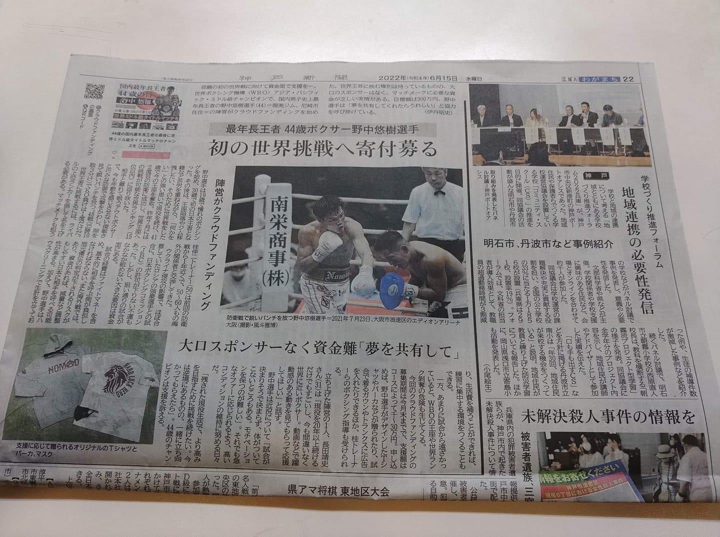 2022年6月15日の神戸新聞に野中悠樹のクラウドファンディング挑戦が掲載されました!先月末に取材して頂く事になりましたが、神戸新聞には以前から度々特集を組んで頂いておりまして、今回の挑戦も応援してもらえる事となりました。お陰様で神戸新聞を見て支援して下さった方もいるので、本当に感謝しております!他にもメディアに取り上げられる予定ですので6月末までクラウドファンディング頑張っていきます!!
