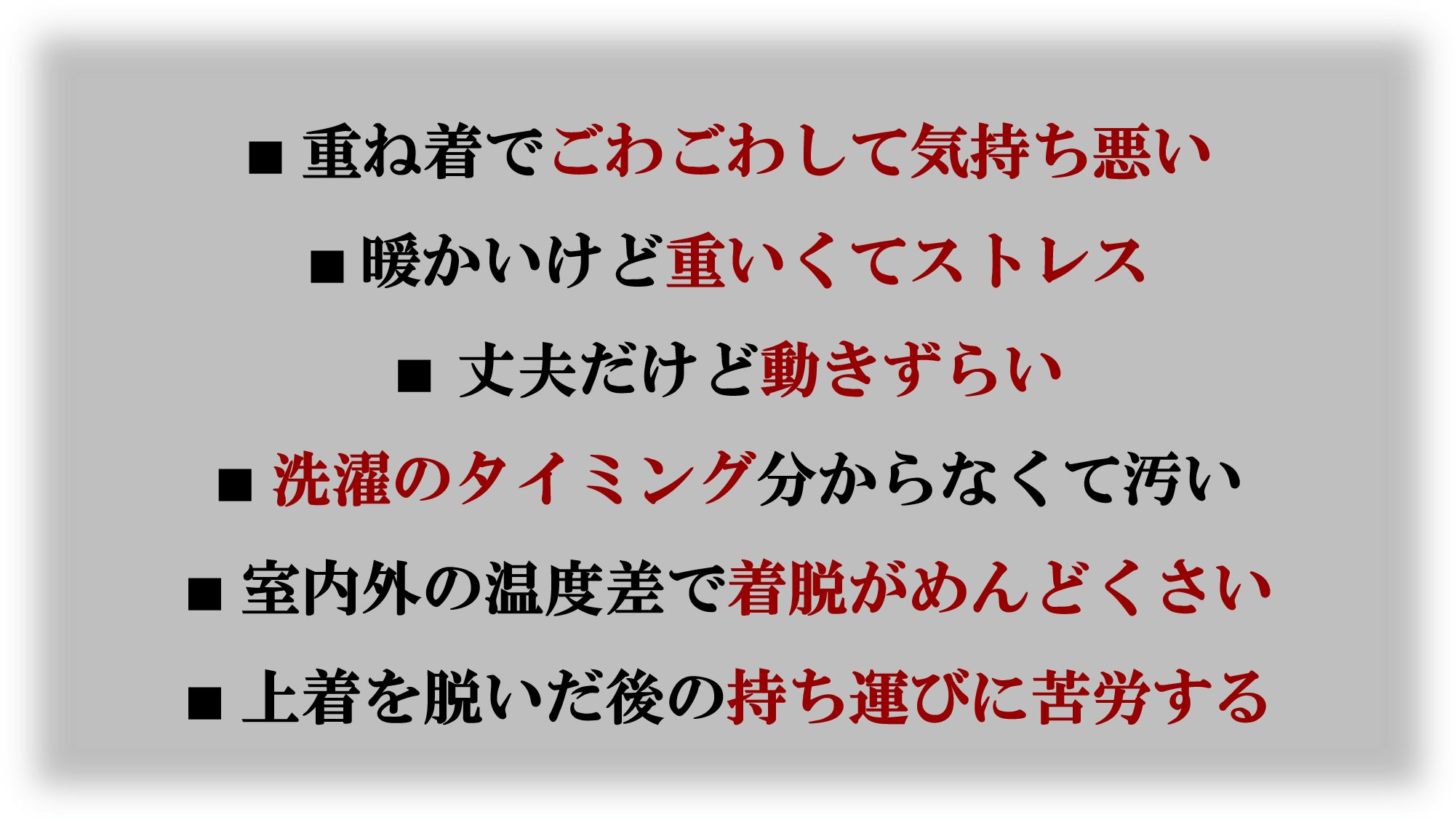 重ね着し過ぎて、着ぶくれして動きずらいしかっこ悪い