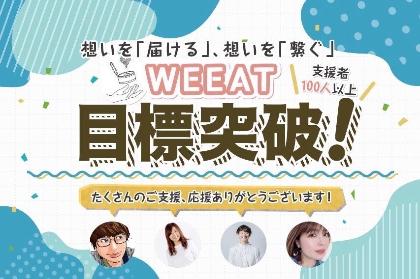 まずメインビジュアルをご紹介させてください!!Twitterで仲良くしていただいているデザイナーの「ゆい」さんが支援者100名突破のお祝いイメージを作ってくださいました!印象に残る素敵なデザインをされているデザイナーさんですゆい|記憶に残すデザイナー (Twitter)https://twitter.com/yui_design_?s=21素敵なサプライズありがとうございます!そして、私たちが目指していた「100名の方に届ける」という目標を本日達成させていただきました!!多くの方に応援していただき、感謝でいっぱいです。期待に添えるサービスとなるようメンバー一同頑張って参りますので今後とも見守っていただけますと幸いです!Team Weeat 一同
