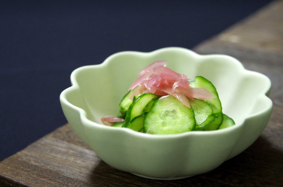 きゅうりの酢の物に、みょうがとみょうがの汁をかけていただくと、味変が出来ます。さっぱりした風味です。