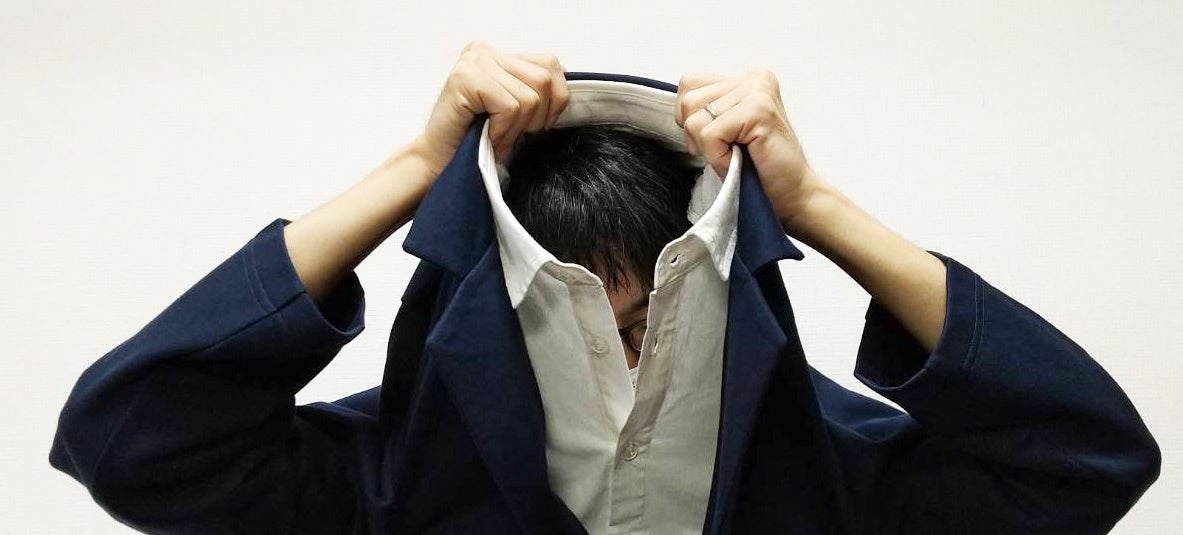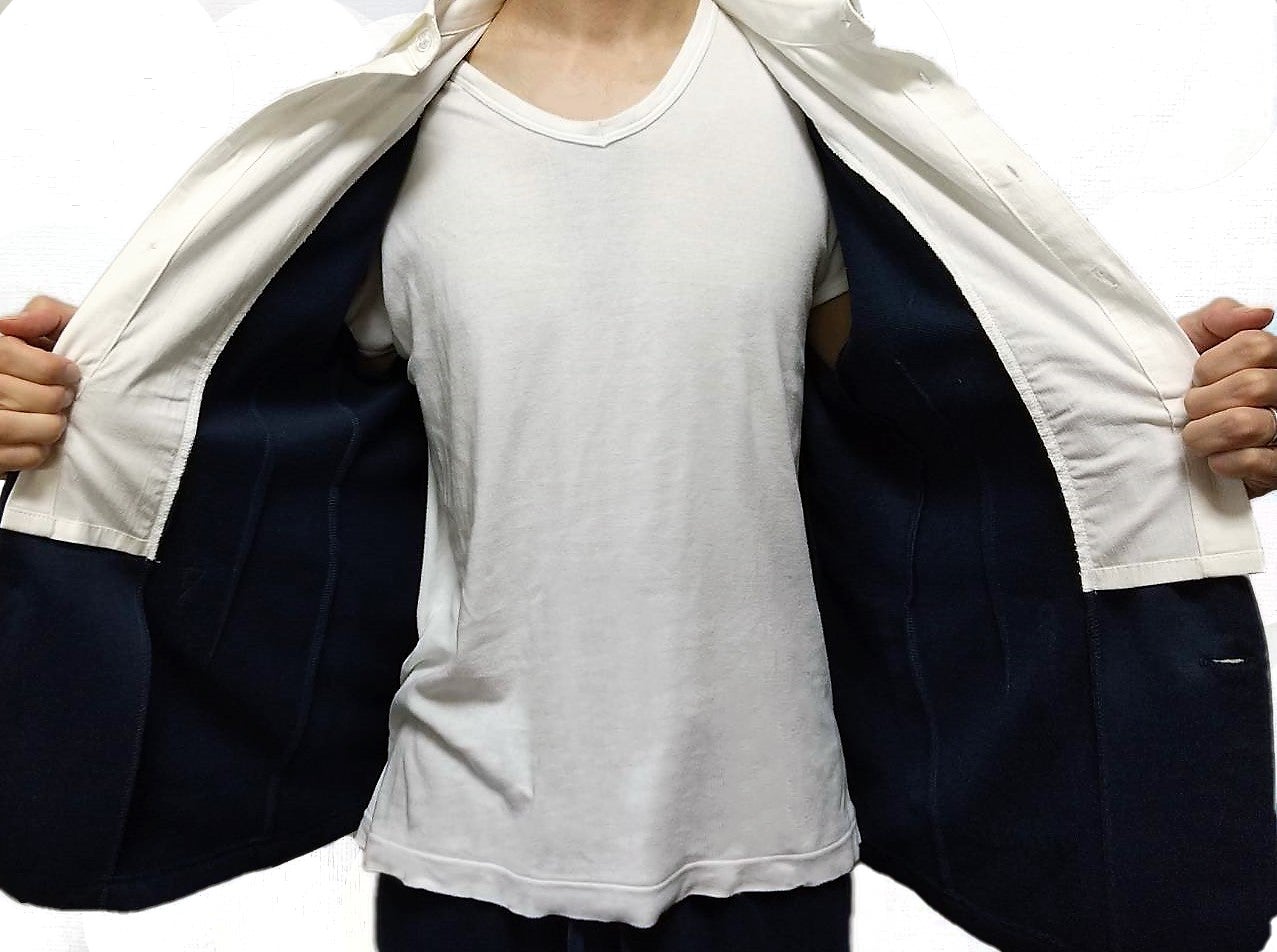 ジャケットの下にビジネスシャツを着ているようにみえますが
