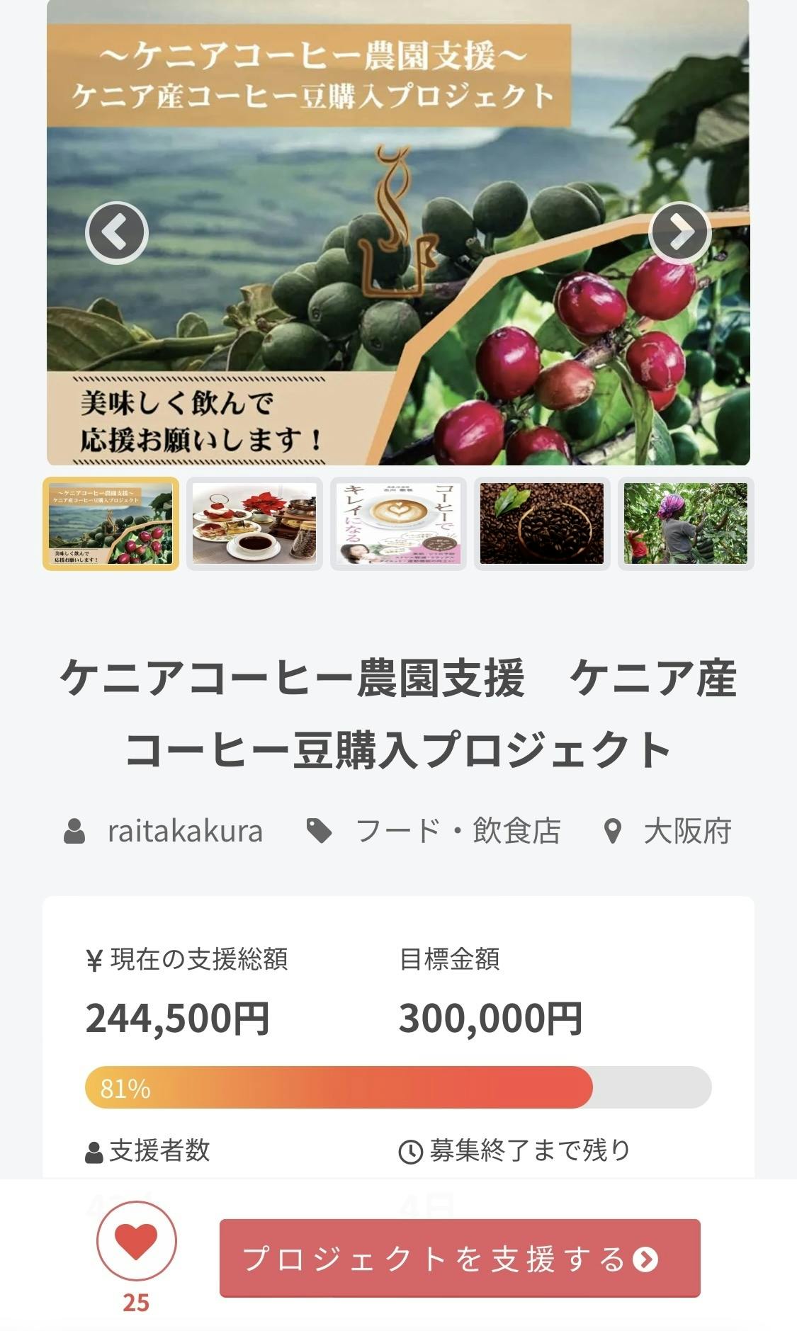 この度、複数のリターンをまとめて支援出来るようになりましたので、この機会に、ぜひ、ケニア産コーヒー豆を使った新ブレンドで、ケニアのコーヒー豆農園の方々を継続的に支援する第一歩にしたいと願っています!