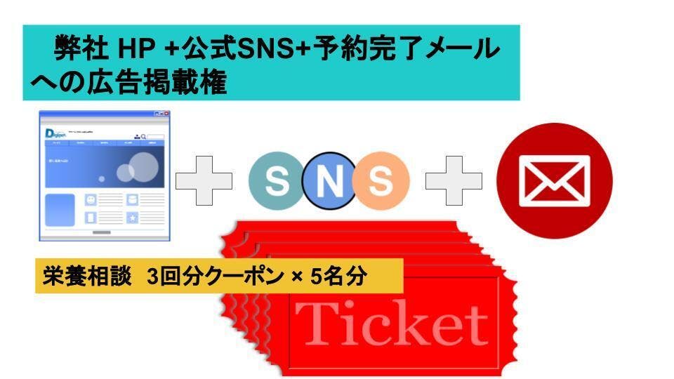 Ⅴ.弊社HP+公式SNS+予約完了メールへの広告掲載権+栄養相談3回分×3人分 支援額50,000円