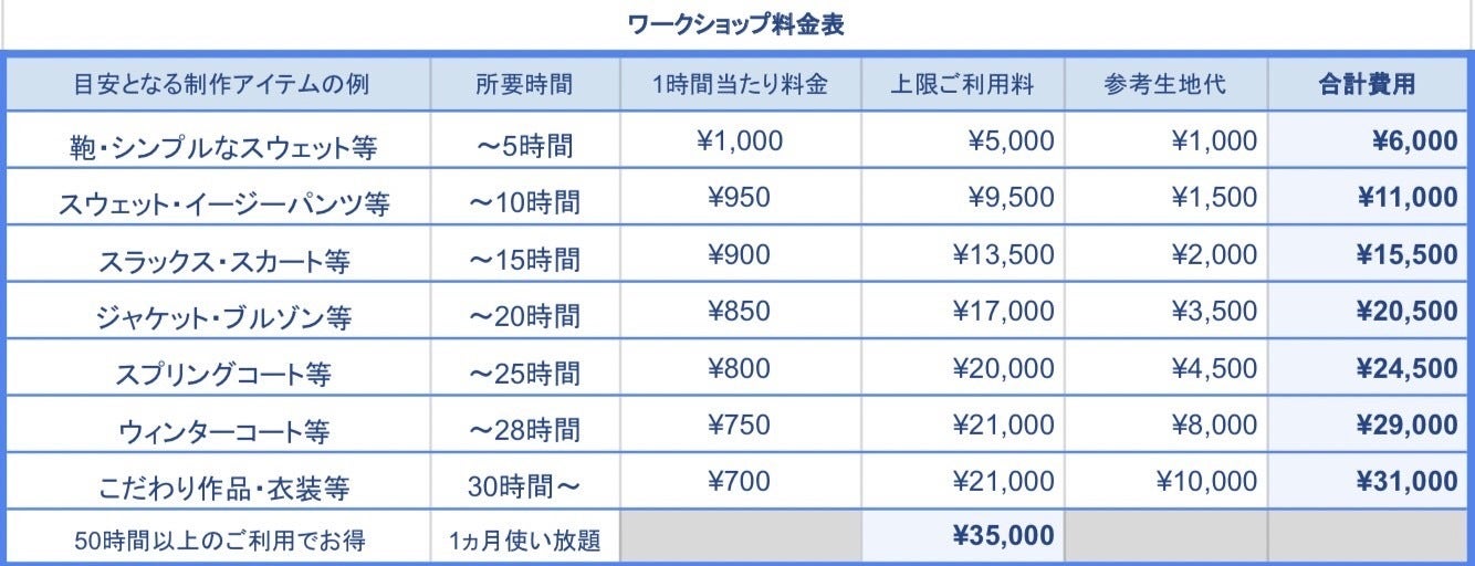 ・ワークショップご利用料金です。アイテム1点ごとに所要時間に応じて決まり、後払いとなります。