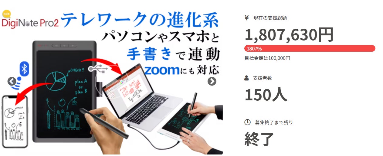 お世話になっております。MKトレードです。『DigiNote Pro2』プロジェクトは、無事に終了いたしました!今回が最後の公開でしたが、おかげさまで「150人」ものとても沢山のご支援をいただき、スタッフ一同、心より御礼申し上げます!!配送までお待たせいたしますが、順次準備を進めさせていただきます。改めまして、この度はご支援いただきまして、誠にありがとうございました!進捗等は、「活動報告」としてご案内させていただきます。引き続き、どうぞよろしくお願いいたします。『DigiNote Pro2』プロジェクトスタッフ一同