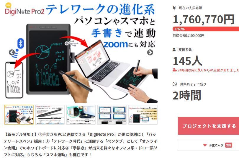 お世話になっております。MKトレードです。『DigiNotePro2』の公開も、いよいよ「残り2時間」となってまいりました!おかげさまで、ただいま「145人」の方からご支援いただき、もうすぐ150人になりそうです。たくさんの応援、本当にありがとうございます。もしも、まだ迷われている方がいらっしゃいましたら、ぜひあらためてご覧いただき、ご検討くださいませ。お得な価格でのご提供も最後となります。キャンペーンも実施しております!詳しくは、下記ページをご確認ください。https://camp-fire.jp/projects/533456/activities/342829 『DigiNote Pro2』プロジェクトスタッフ一同
