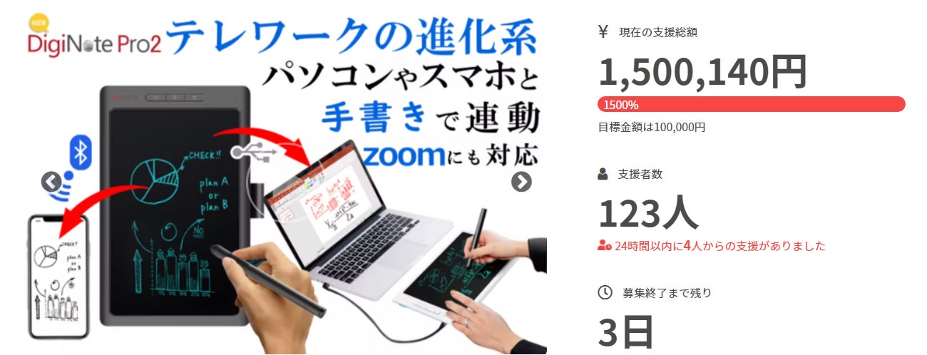 支援者のみなさまページをご覧くださったみなさまお世話になっております。MKトレードです。本プロジェクトの公開は、「残り12時間」となってまいりました!『DigiNote Pro2』は今回で最後の公開となります。お得な価格でのご提供も最後となりますので、ご検討中の方は、ぜひ宜しくお願いいたします。この最新モデルでは、バッテリーレス専用ペンを採用し、ペンは充電の必要がないため、とても便利です!おかげさまで「130人」を超えるご支援をいただいており、スタッフ一同、心より感謝申し上げます!!また、公開期間中は、リピーター様に対して「「DigiNote Pro2 専用ケース」プレゼントキャンペーンをを実施しております。詳しくは、下記ページをご確認ください。https://camp-fire.jp/projects/533456/activities/342829応募条件をご確認の上、たくさんのご応募お待ちしております!!公開は、本日(1月31日)23:59までとなっております。最後まで、どうぞよろしくお願いいたします。『DigiNote Pro2』プロジェクトスタッフ一同