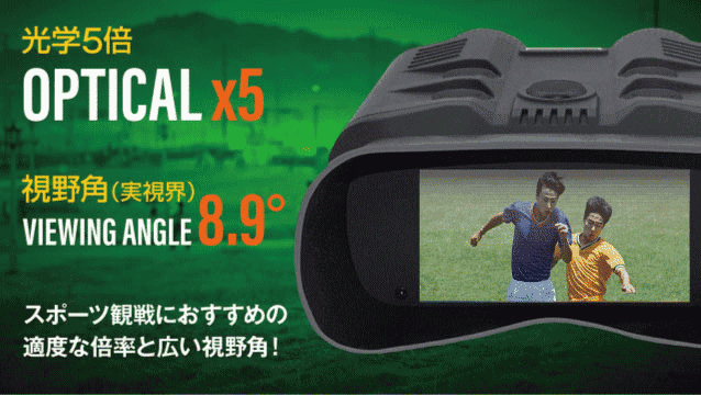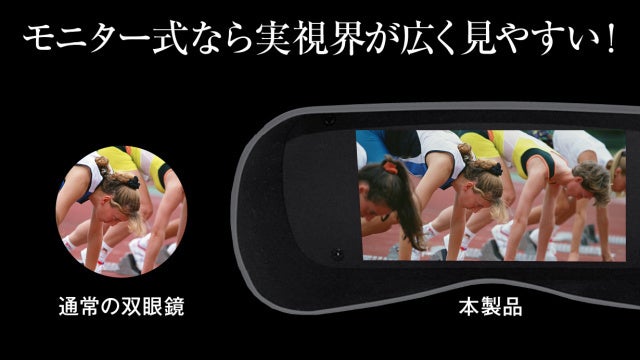 一般的な双眼鏡は覗き込んだときに実視界が丸く見えますが、大型カラーディスプレイを搭載した本製品は、ワイドな映像でまるで間近にある特等席で見ているような迫力を楽しめます。