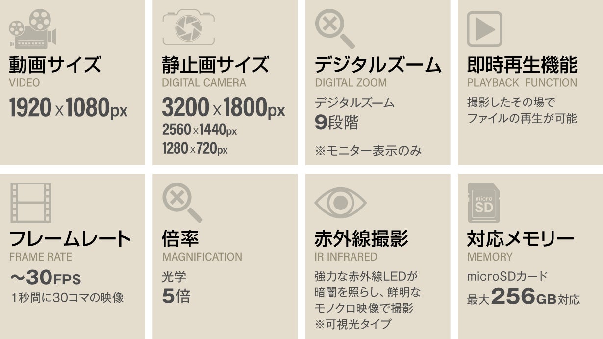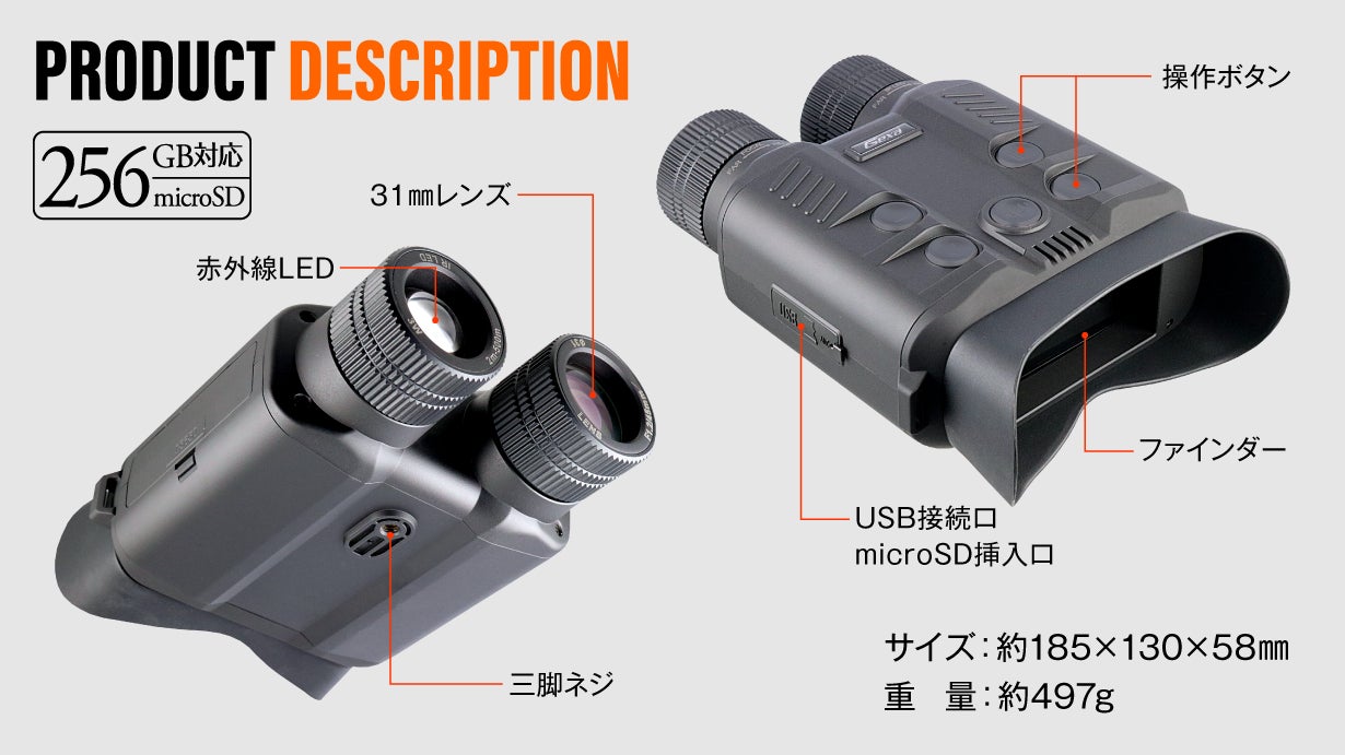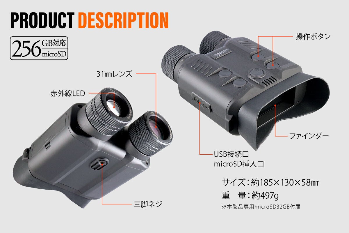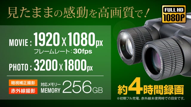 通常の双眼鏡として、スポーツ観戦、ライブ、イベント、動物観察、アウトドアやフィールドワーク、天体観測、サバイバルゲーム、災害時、などなど、昼夜問わず利用できる本製品が、みなさんの「見たい・撮りたい」を叶えてくれます。