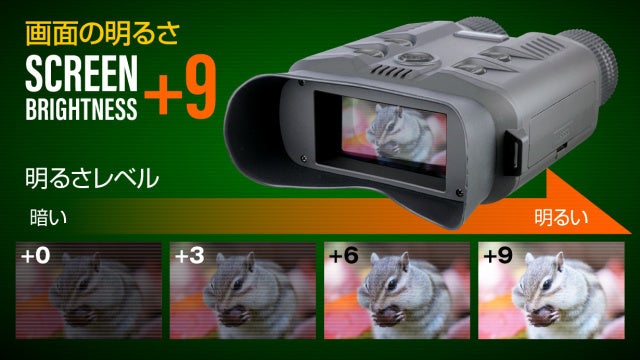 日中は外光で液晶画面が見にくい?そんな心配は必要ありません。本製品の液晶画面は9段階で明るさの調整ができるので、日差しの強い日中でも快適に観察・観戦が可能です。