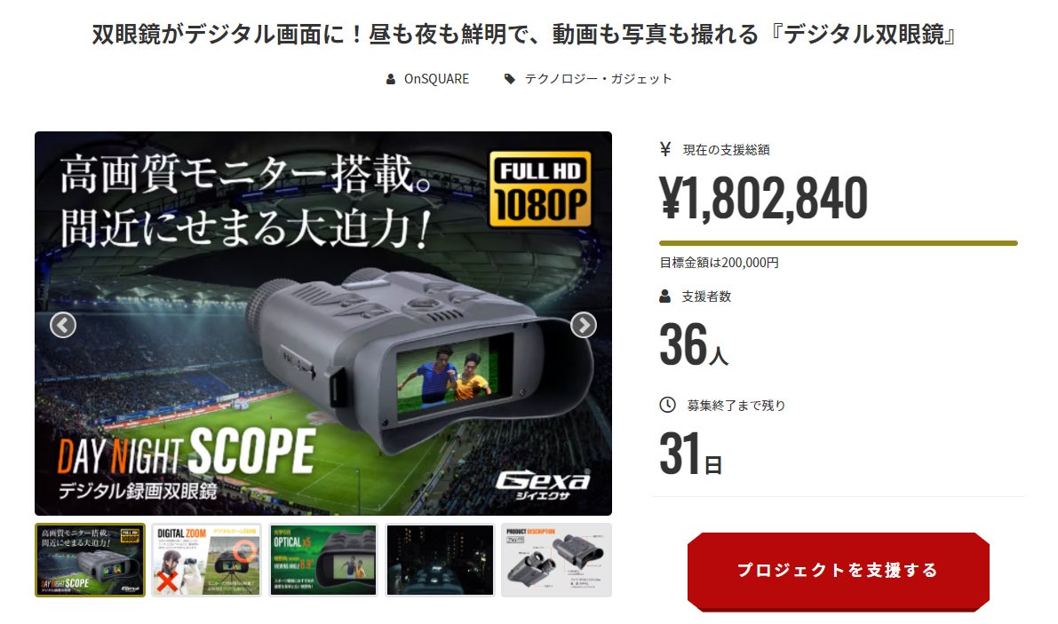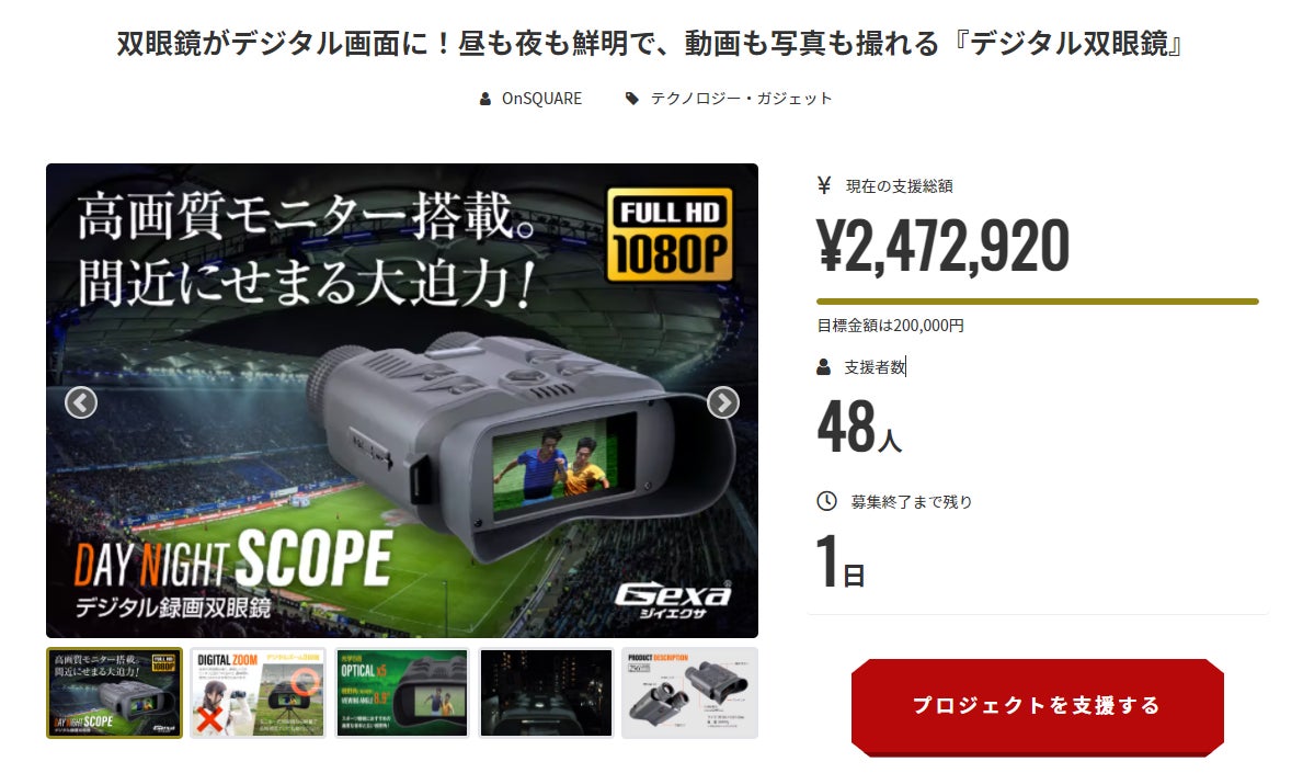 みなさま、こんにちは。本プロジェクト「双眼鏡がデジタル画面に!昼も夜も鮮明で、動画も写真も撮れる『デジタル双眼鏡』」も、残すところ1日となりました。ご支援者の皆様のおかげで、現在1000%以上を達成できております。本製品を割引価格でご提供できるのは、machi-ya(CAMPFIRE)が最後となりますので、迷っている方がおられましたら、ぜひご支援をお願いいたします。