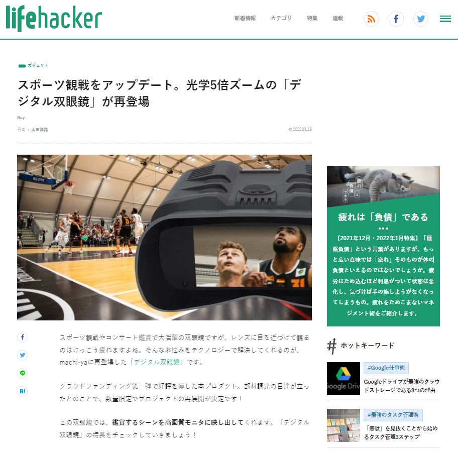 みなさま、こんばんは。本日は大変嬉しいお知らせです。なんと、知らぬ間に ライフハック記事を得意とする「ライフハッカー[日本語版]」で、デジタル双眼鏡のプロジェクトが紹介されていました。https://www.lifehacker.jp/article/machi-ya-sougankyo-start/お恥ずかしながら、私どもがプロジェクトページで表現しきれていない内容まで、うまく掲載していただき感謝の一言しかありません(笑ご支援いただいた方も、支援しようか悩んでいる方も、ぜひお時間のあるときに読んでみてくださいね。