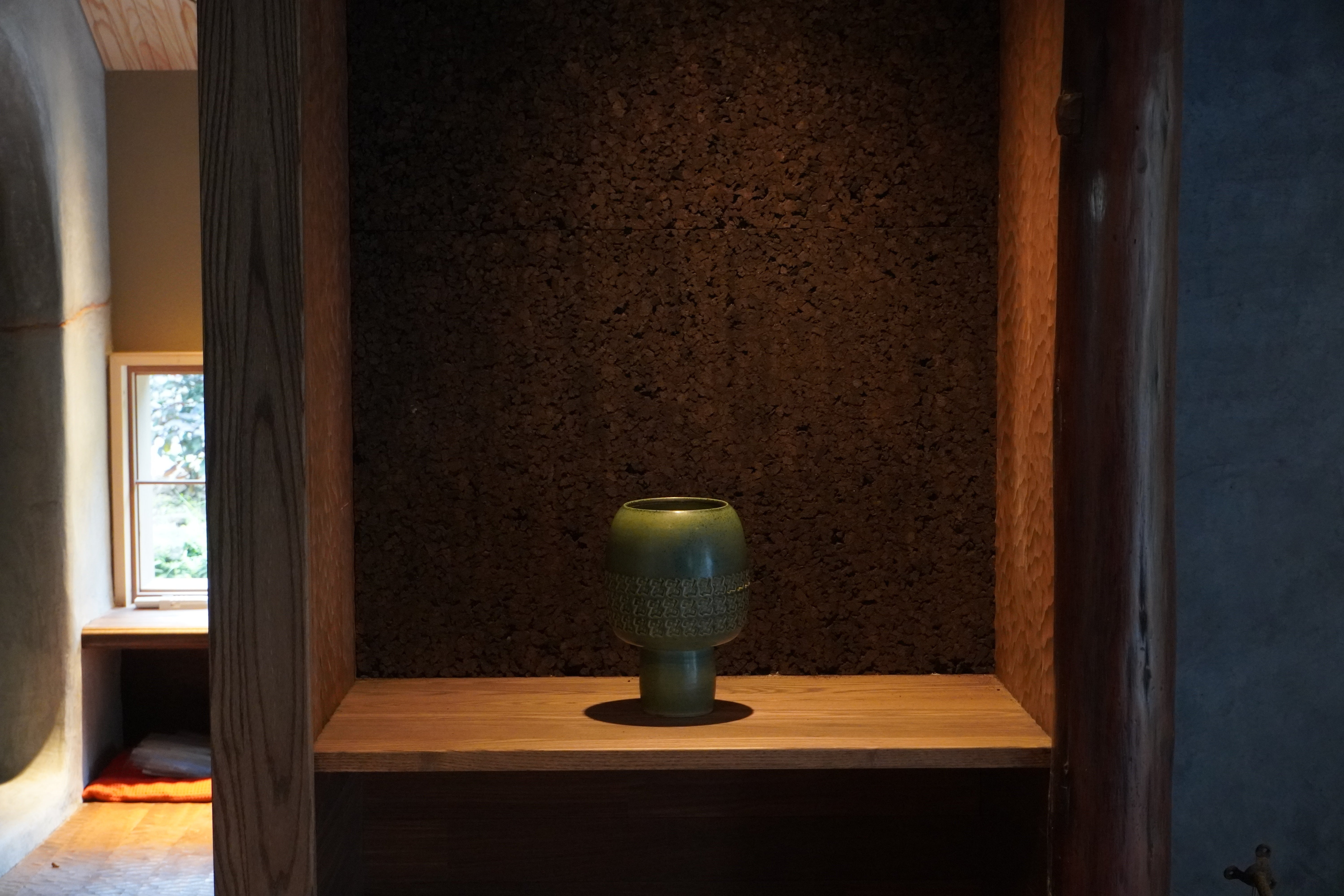 日本家屋感溢れるこの空間に置かれる一つの花瓶。下から徐々に口が広くなるわけでも、楕円を盾にしたような緩やかな曲線で終わるわけでもなく、小さな底から真っ直ぐ上に伸びた後、ぷくっと膨らみを持つこの形。ころんとしているというのか、このぽってりした形がかわいい。落ち着いていて上品なグリーンに切り抜かれた模様は綺麗に整列してあります。山猫に置くインテリアの中でも結構早い段階で手に取られたものでした。さて、こちらの生花が活けられるのかドライフラワーが飾られるのか、はたまた、選ばれたものにしか見えない…なんていうものが飾られるのか。