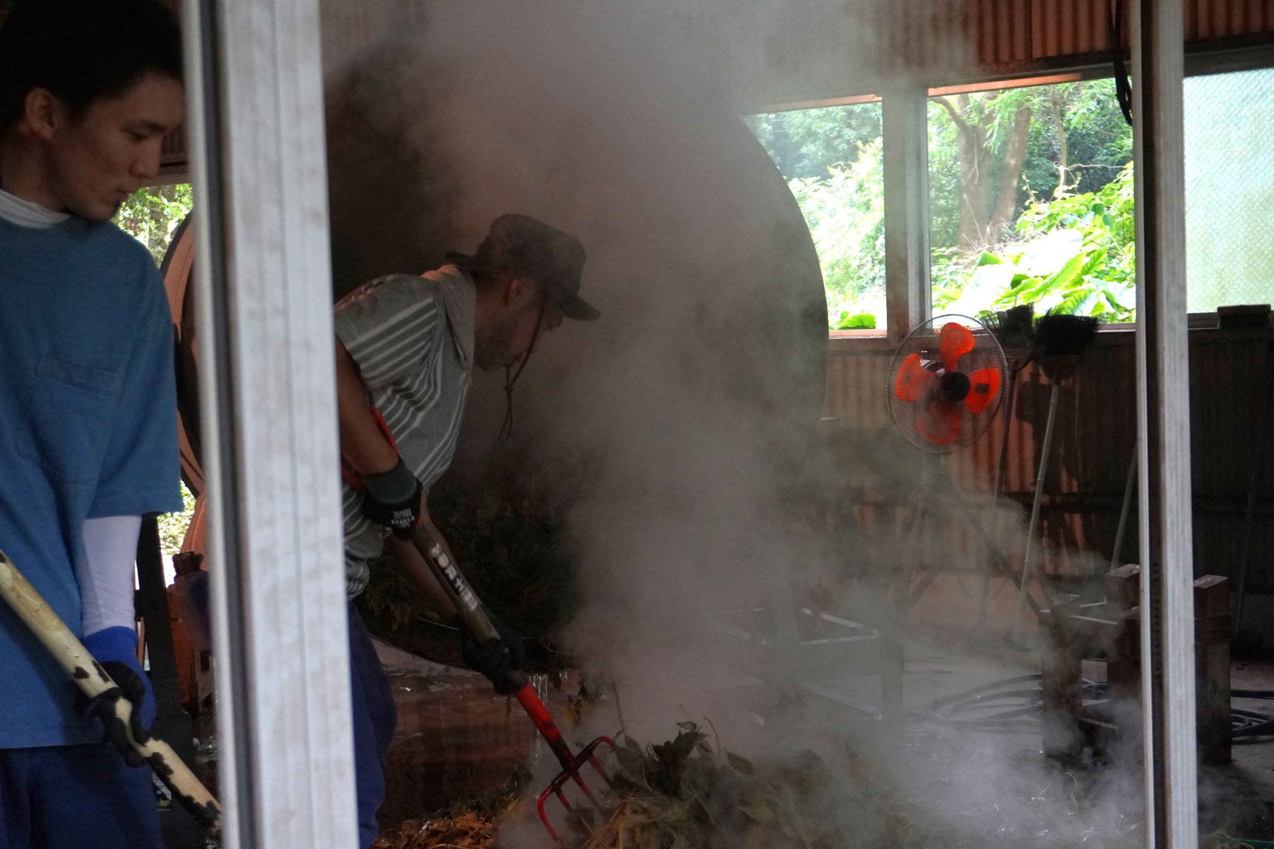 蒸された芳樟を釜から取り出して、ひたすら外へと移動させます。まだ温かいのでまるでサウナのような光景。外に出された芳樟はもわもわと湯気を立ち上らせていました。