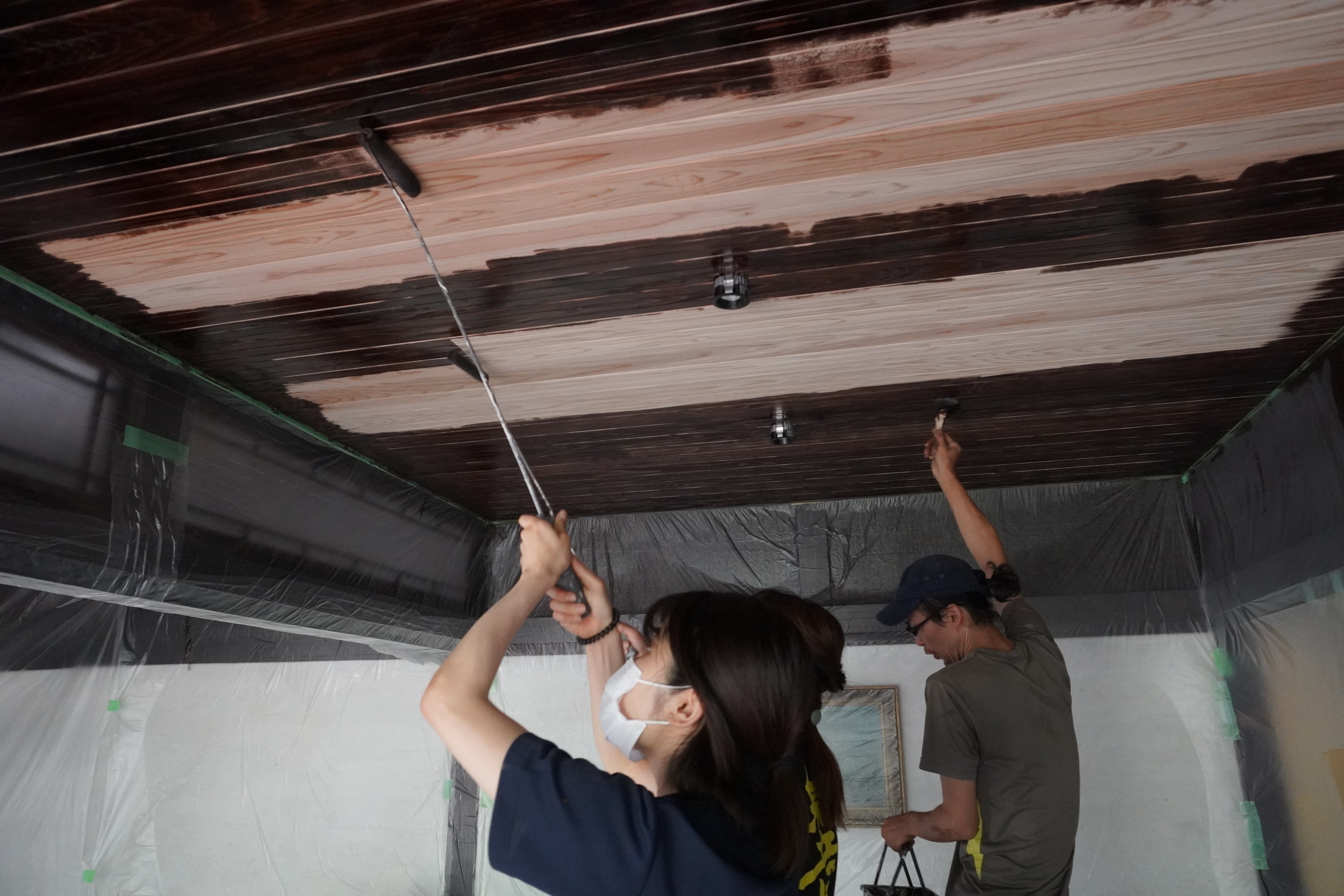 まずは壁や梁などが塗料で汚れないようにマステとマスカーを貼っていきます。貼ったらいよいよオイルを塗っていく段階へ。