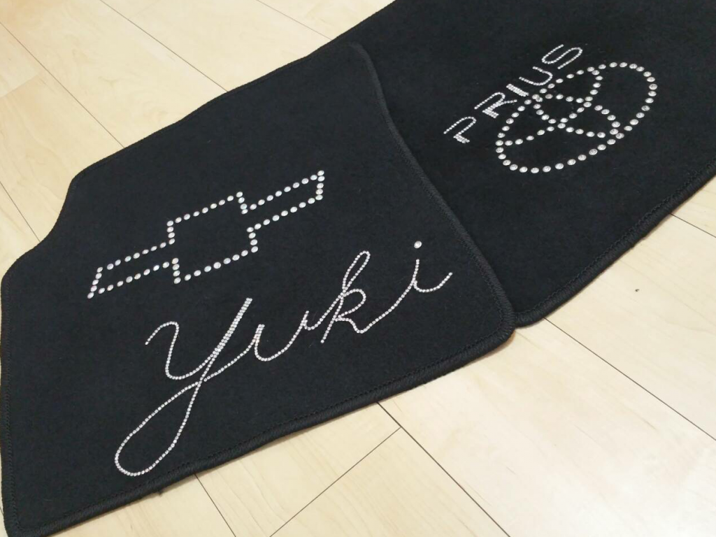 車のフロアマット運転席、助手席、後部座席の4枚(車種によっては5枚)をデコレーションいたします。どれか一枚は「G」マークを、残り3枚(車種によっては4枚)はご希望のデザインをデコレーションいたします。