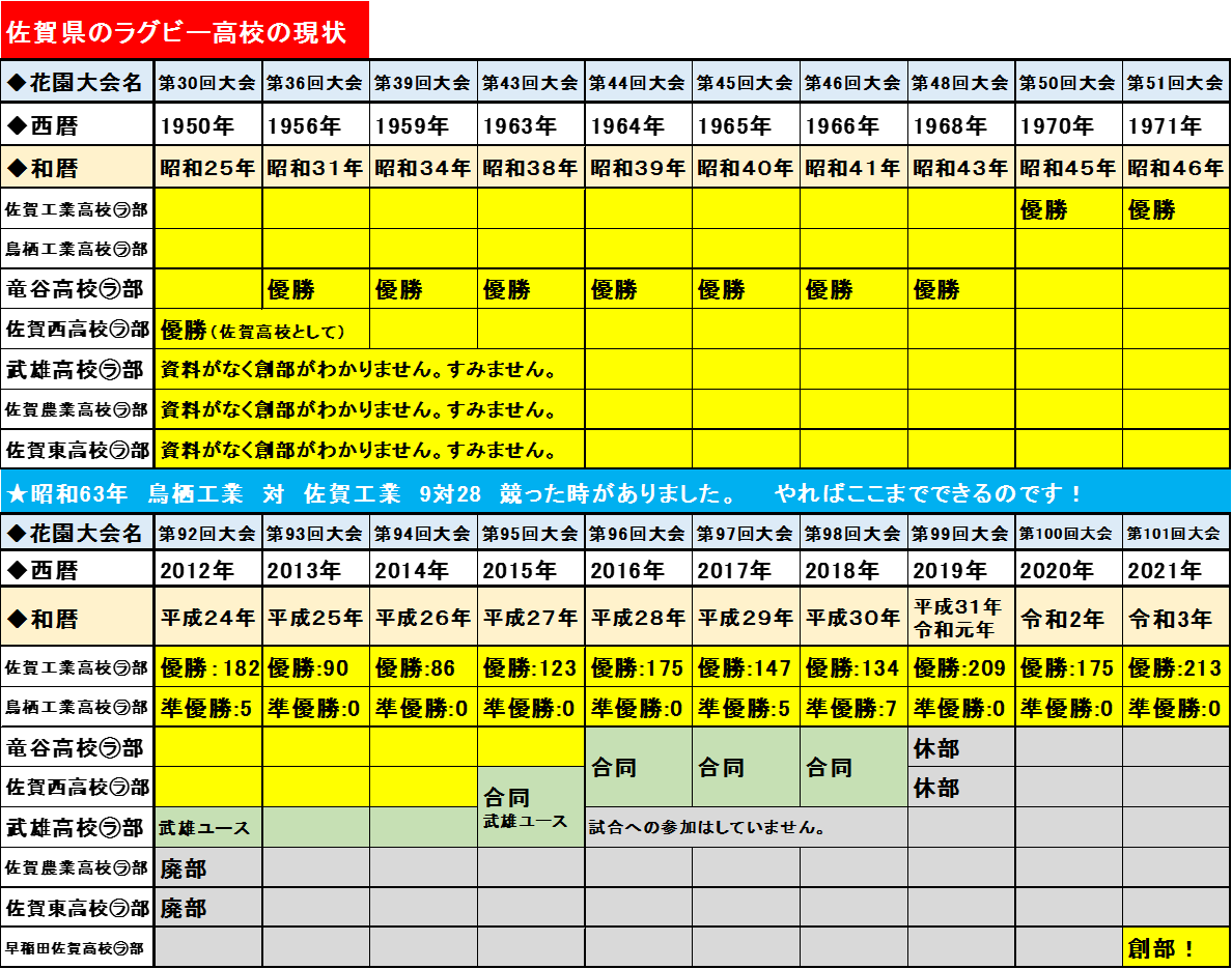 ②私の思い 実はずっと前から、佐賀県の高校ラグビー校の行く末を案じていました。私が現役だった頃、ラグビー校は7校ありました。しかし今 佐賀工業に挑むのは鳥栖工業だけ(’21年秋から早稲田佐賀ラグビー部が発足!祝)。鳥栖工業ラグビー部が、ずっと1校で頑張ってきました。毎年大差で佐賀工業ラグビー部に負けます。悔しいと思います。痛いと思います。でも彼らは雑草のようにまた立ち上がり、挑戦しています。夢が途絶えても、しっかり次の後輩に伝統をつないでいます。素晴らしいじゃないですか。