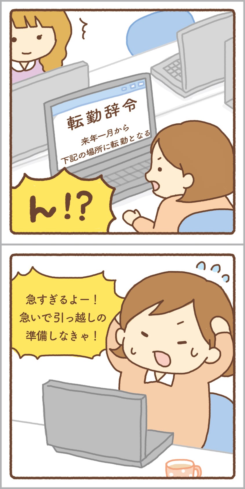 頑張っておうちに帰っていたところ、お姉さんに会社から突然の異動の辞令が!