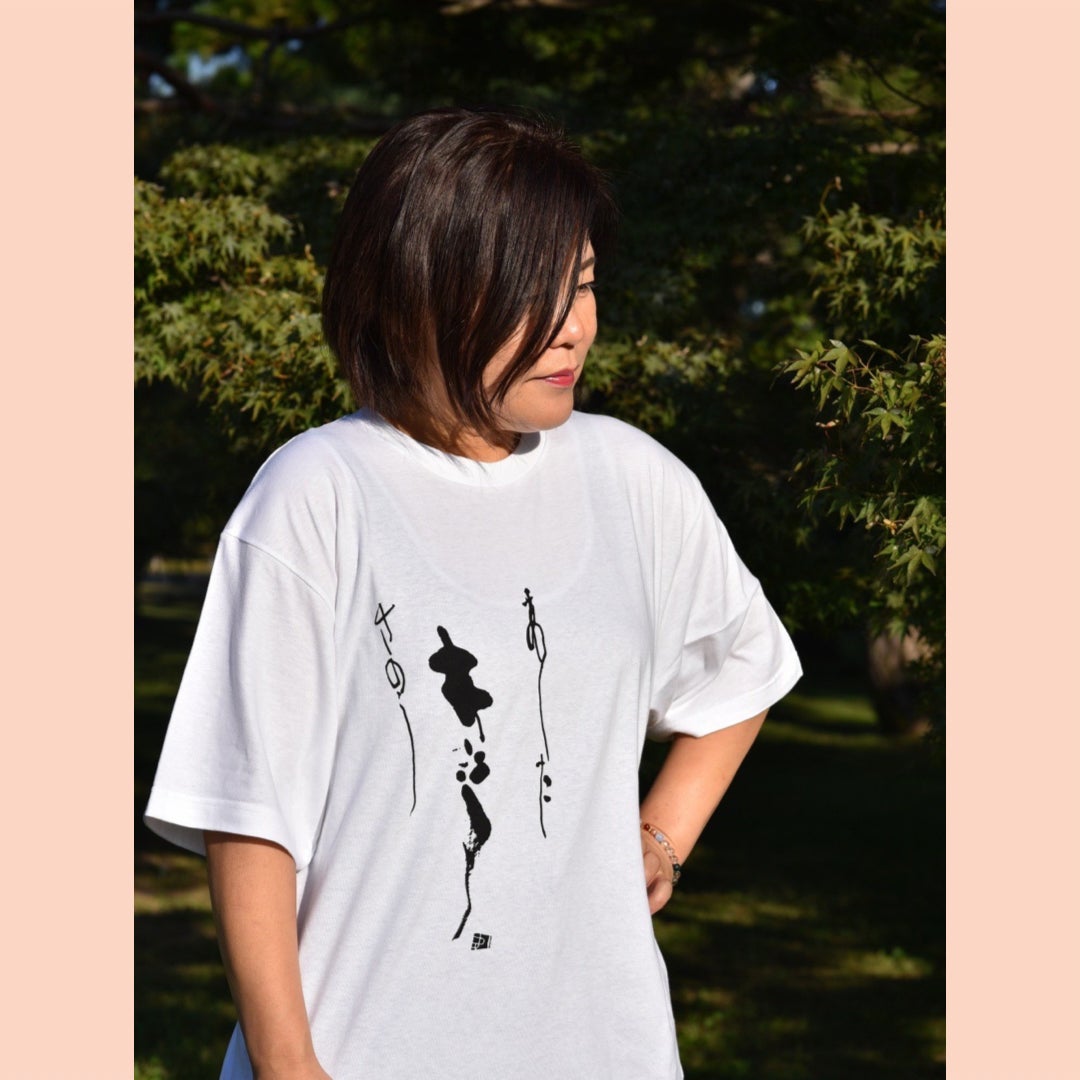 こちらは2月の個展でお披露目となった、知史オリジナルTシャツです!『きのう・きょう・あした』という、知史の書が前面にプリントされています。