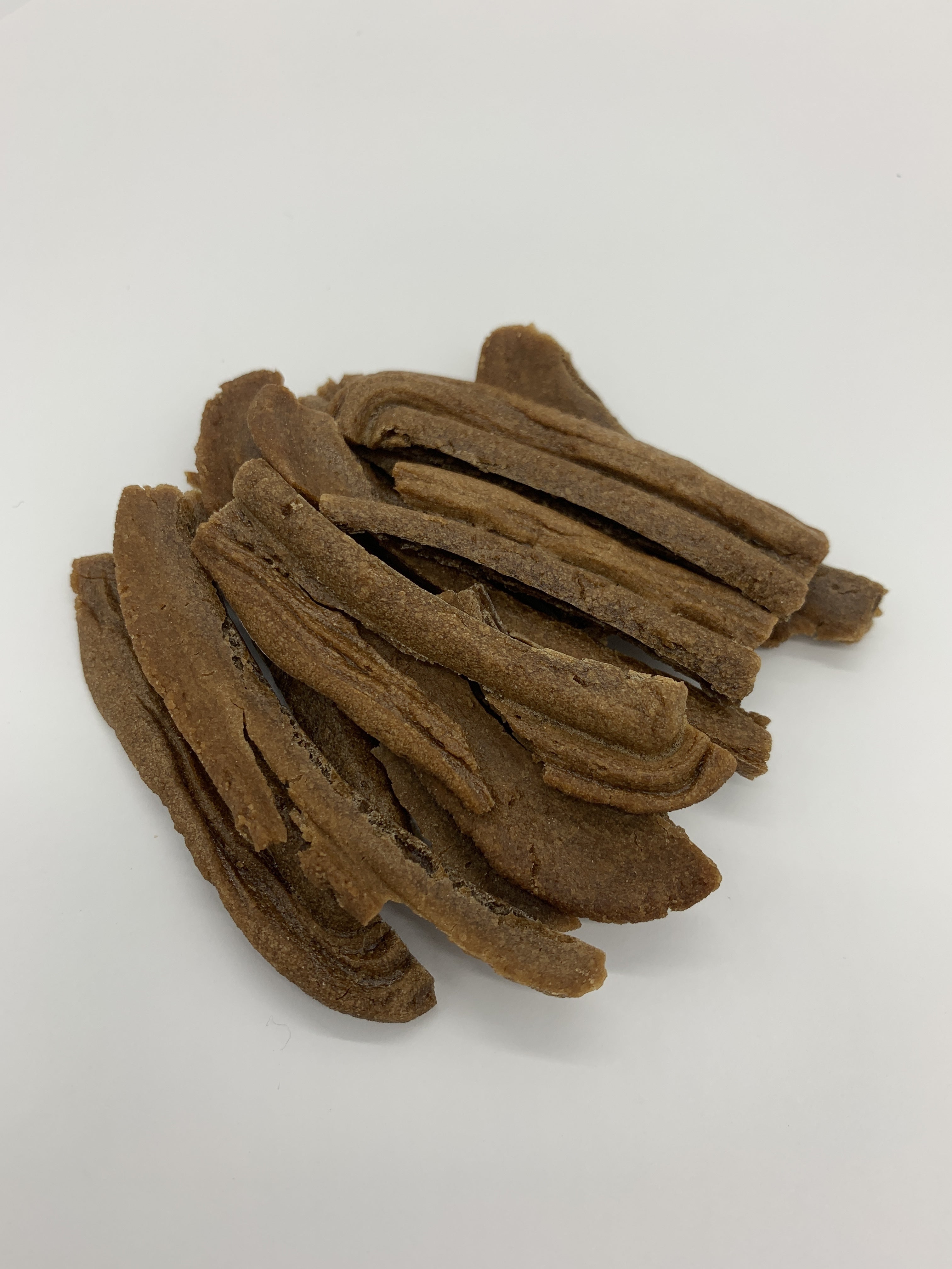 一般的には健康食品登録(専ら健康維持食品として使用される成分本質リスト参照)の原材料を使用し、愛犬の健康維持に合わせたおやつを製造しております。
