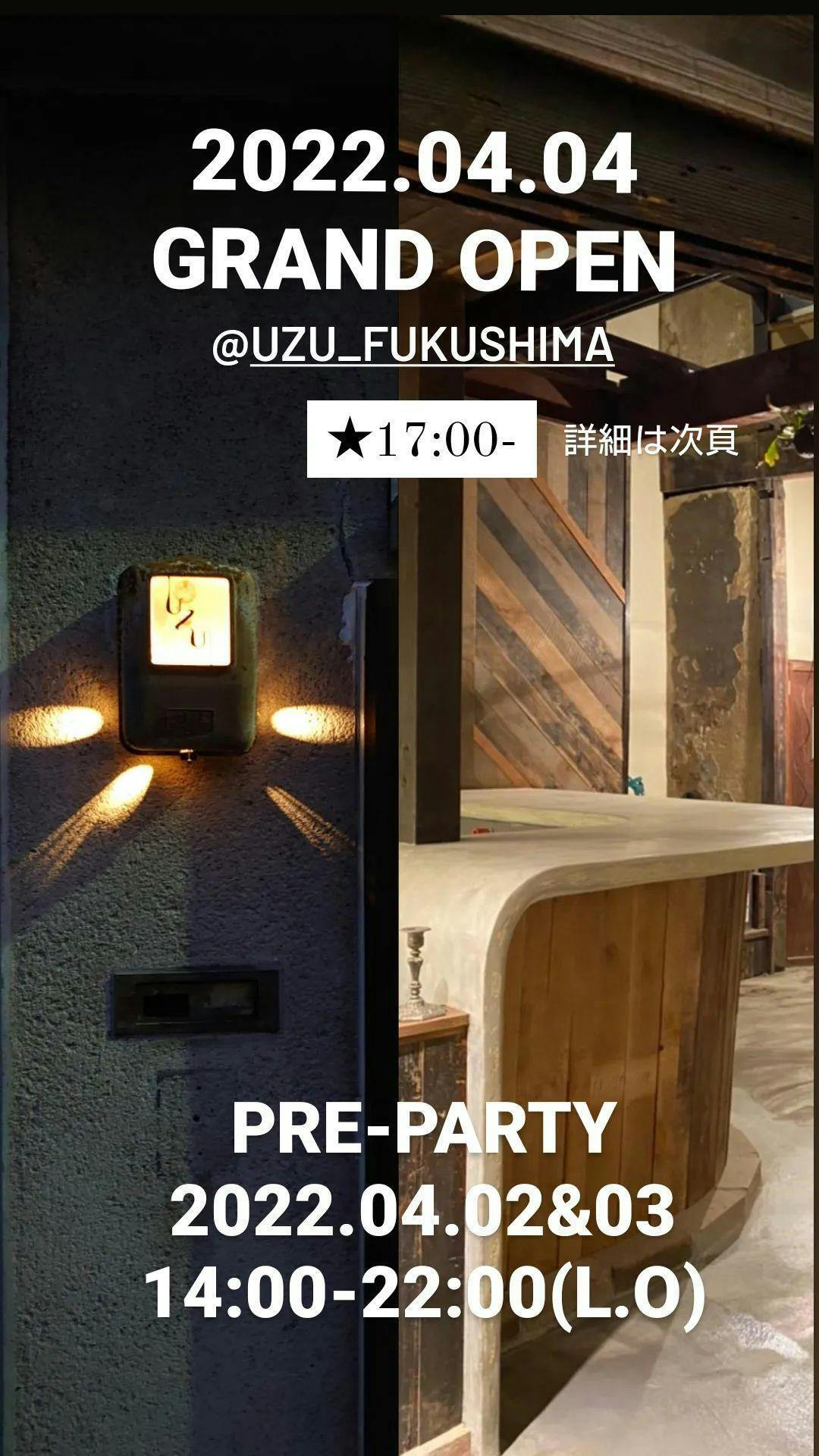 2022/03/30 09:37皆さんおはようございます!!施工中、遊びに来てくれた皆様有難うございました!!いよいよ…【UZU】2022/04/04★★(注)17:00-グランドオープン!!その前に…UZU プレパーティ!!4/2(SAT) &4/3(SUN)14:00-22:00(L.O)①申し訳ありませんが2日間は“キラorセナと面識がある方のみ”のご来店をお願い致します。(お連れ様はOK!)②特別価格&限定メニューによる営業となります。多分モタモタバタバタします!サービス価格にて許して下さい。。③フードも通常よりミニマムになります。④特別価格により、クラファンチケットご利用いただけません!⑤キャッシュレス決済の対応が間に合わなかった場合、現金のみとなります。⑥ラッピングはまだ対応できていません。⑦オープンの4/4は17:00スタートとなります。オープン前にこんなに沢山の方々に携わって頂くとは私自身、思ってもみなかった事で嬉しいのと不思議なのと良い意味でプレッシャーになりました!!しかしまた新しい事をさせて頂ける事には感謝しかありません。ご満足頂けるよう、誠心誠意頑張ります!♡♡皆様に会えることを心より!!楽しみにしております!UZU(ウズ)大阪市福島区福島8-6-706-4400-446014:00-22:00(L.O)定休日は月曜日の予定ですがしばらく不定休です。 もっと見る