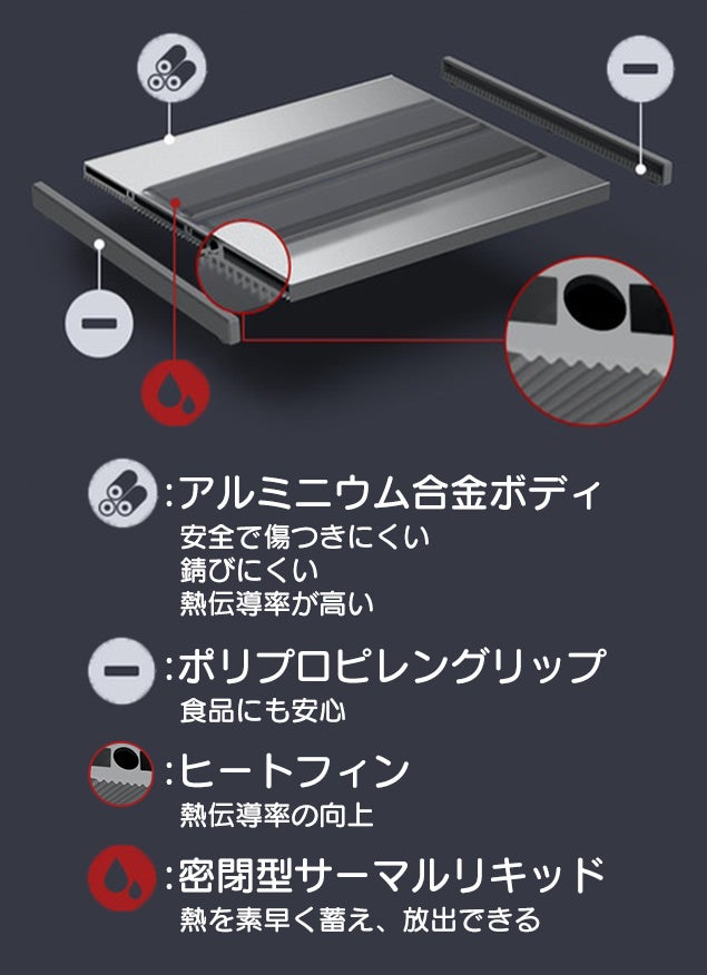 また、ICEGONEの特徴は、プレート内部の密閉型サーマルリキッドとヒートフィン。
