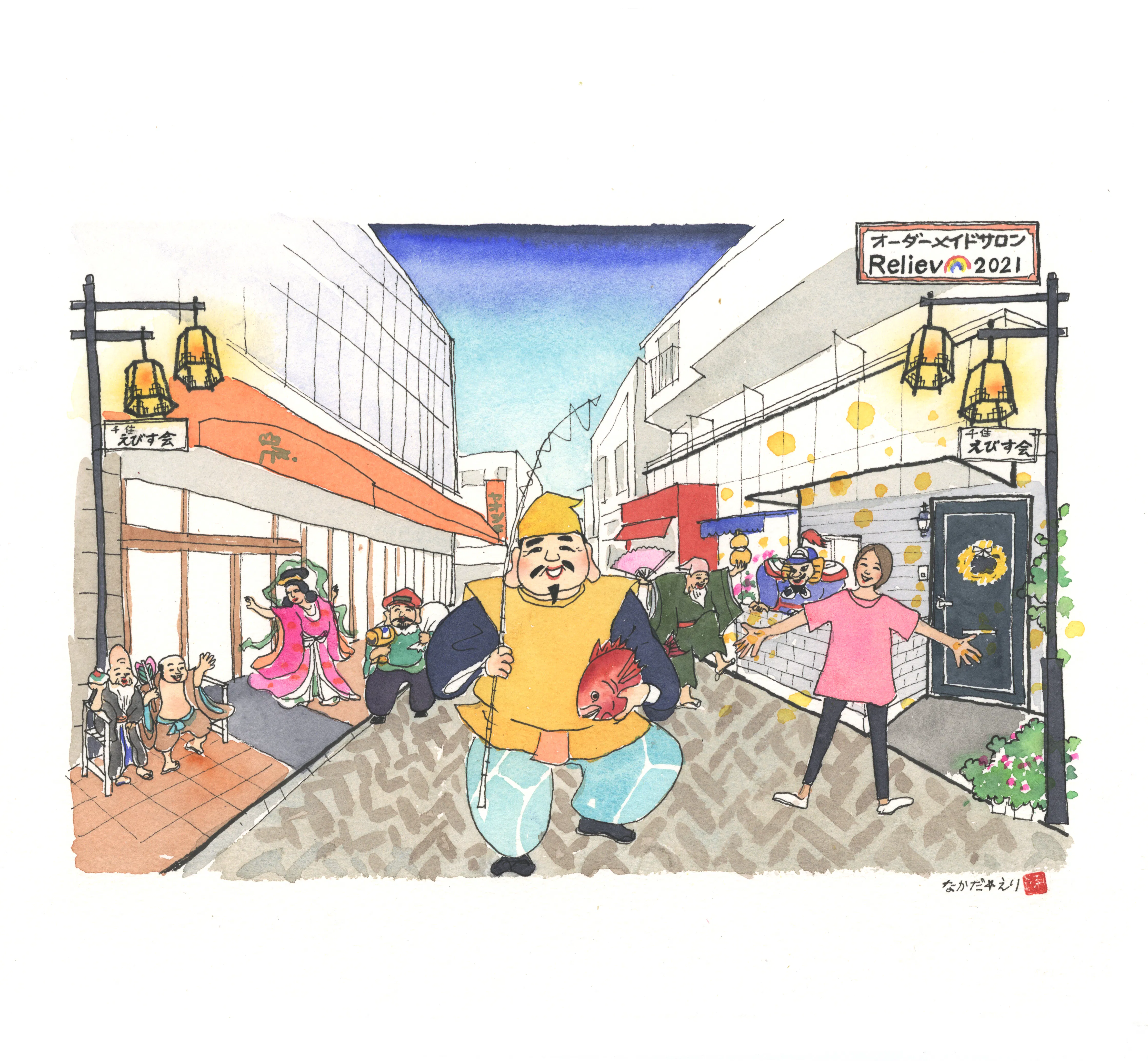 タイトルの写真は、えびす会という商店街のなかにサロンかあるのでえびす様をセンターに七福神に仲間入りさせていただいております♪