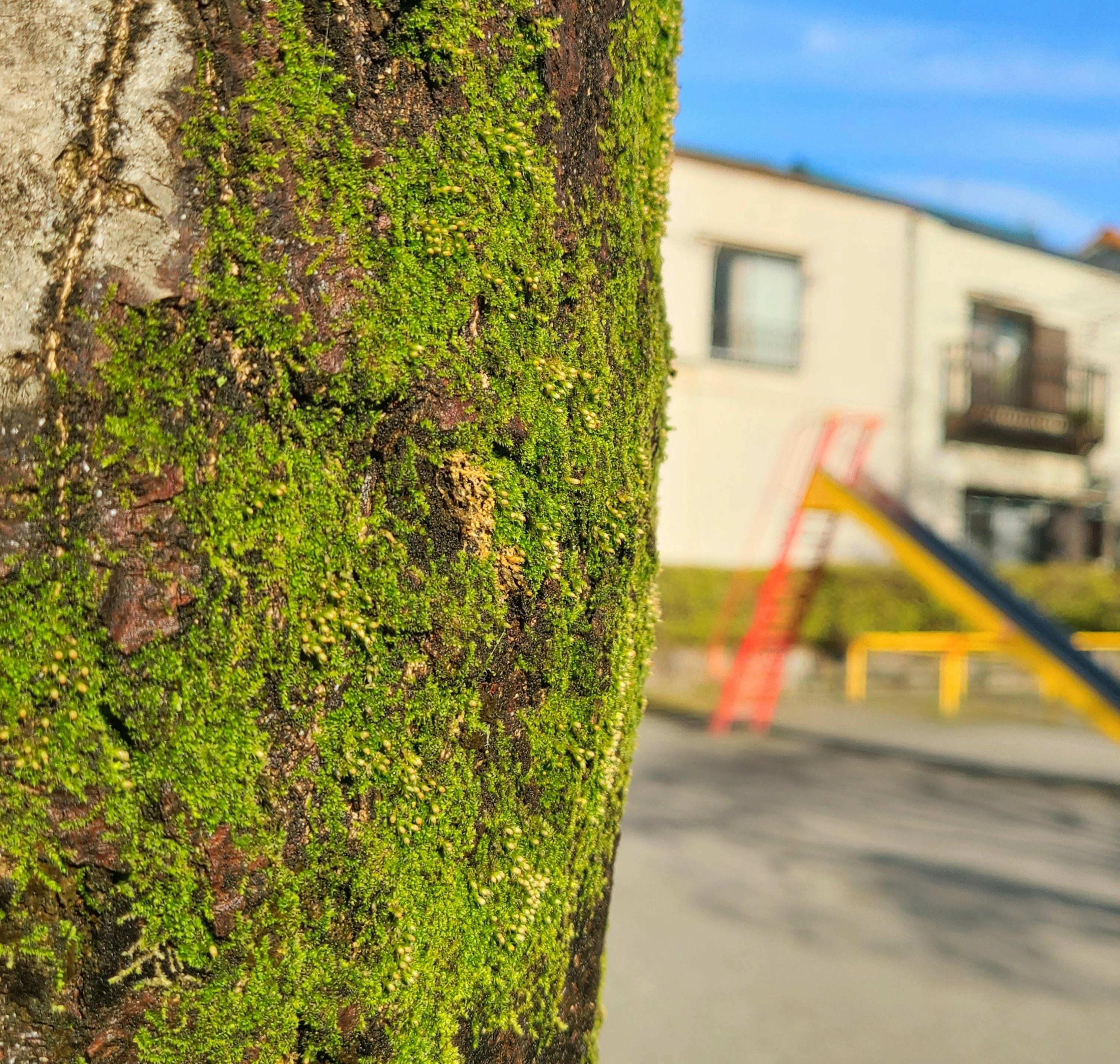 コケの中にいるとたくさん生い茂ってコケしか見えない。でも、少し離れたら見えたら?滑り台が見えてくる。