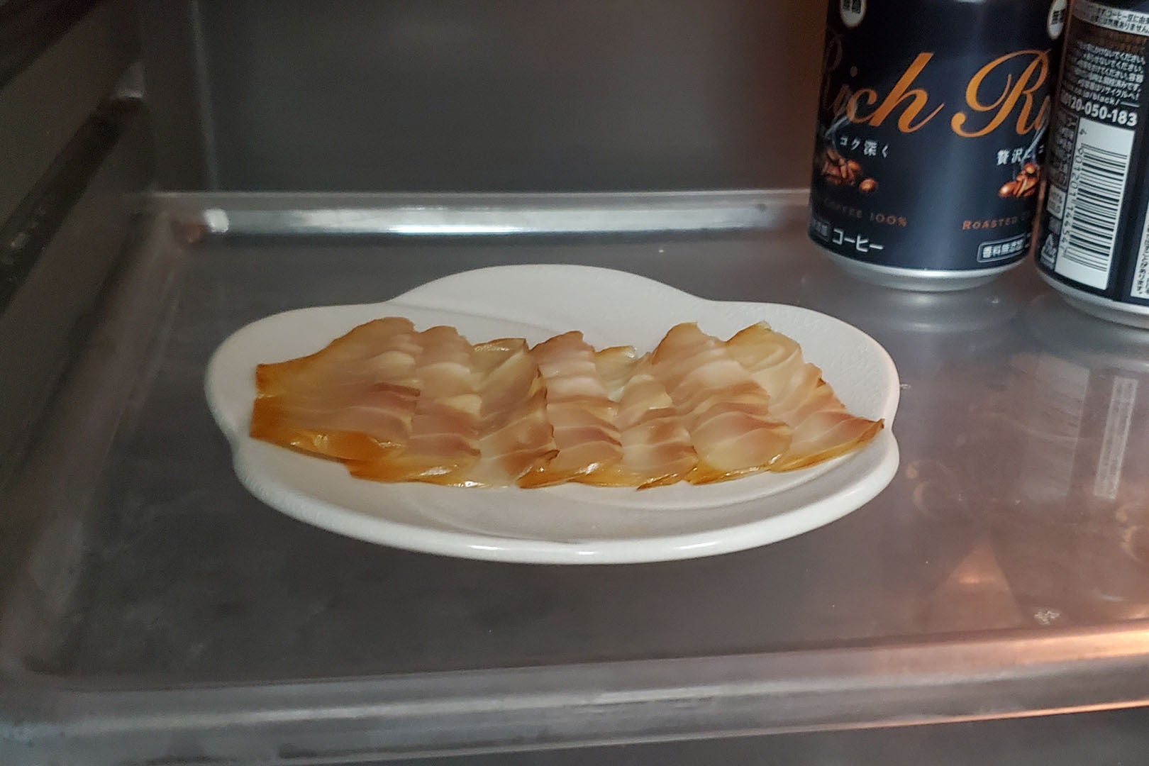 まずは、クラウドファンディング返礼品のチョウザメの生ハムを開封し、お皿に並べてラップをせず冷蔵庫に入れます。