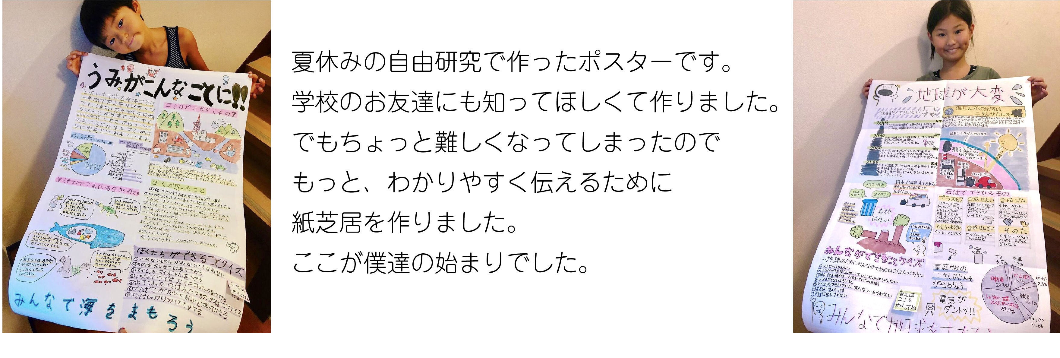 初めにも書きましたが、僕たちは、学校のお友達にも、今の地球と海の困りごとを知ってほしくて、2年前の夏休みの自由研究でポスターを作りました。