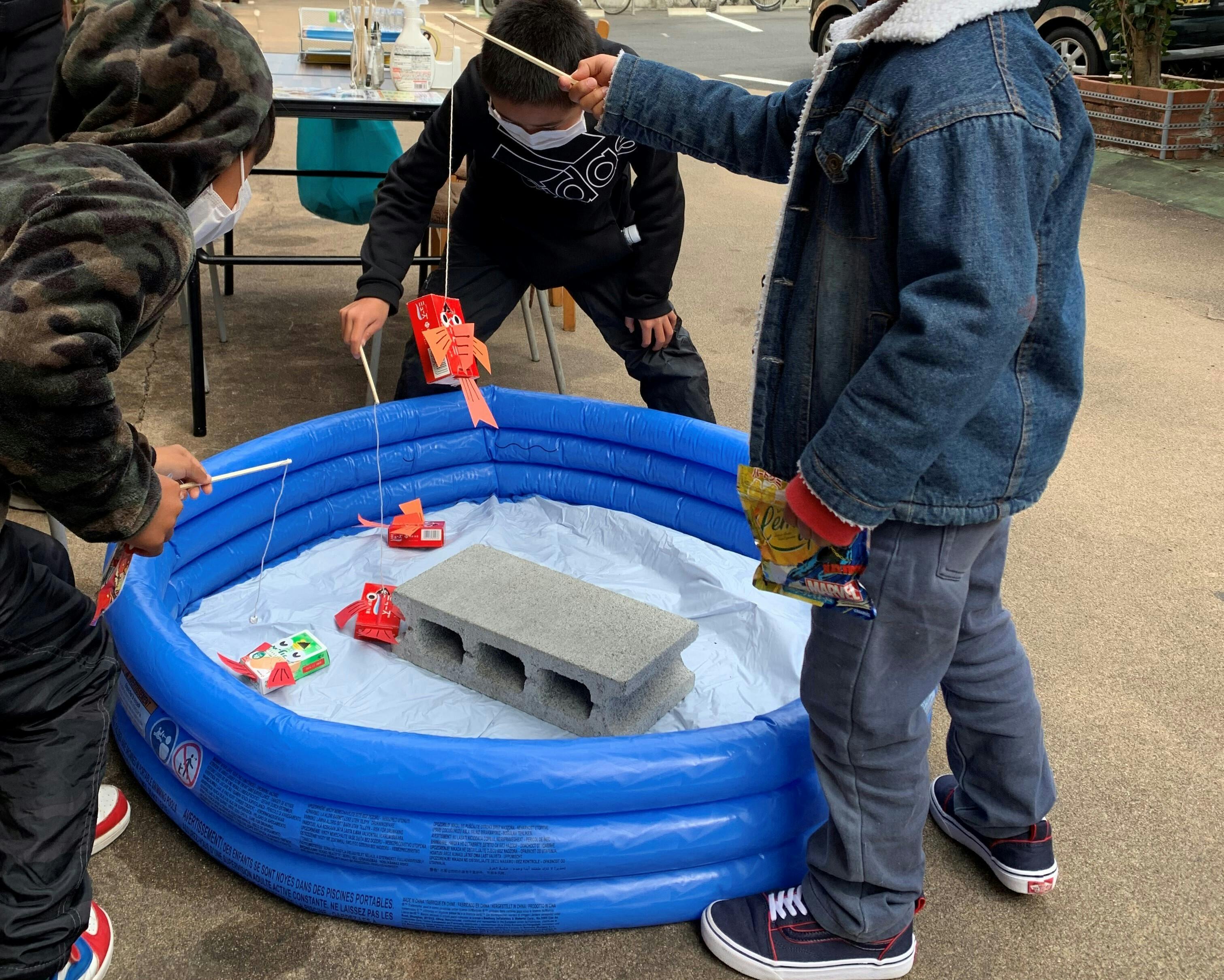 お店の外をお借りして、子供たちにワックルはかせの「金目鯛の魚つり」の工作を作って、遊ぶ体験をしてもらうことができました。