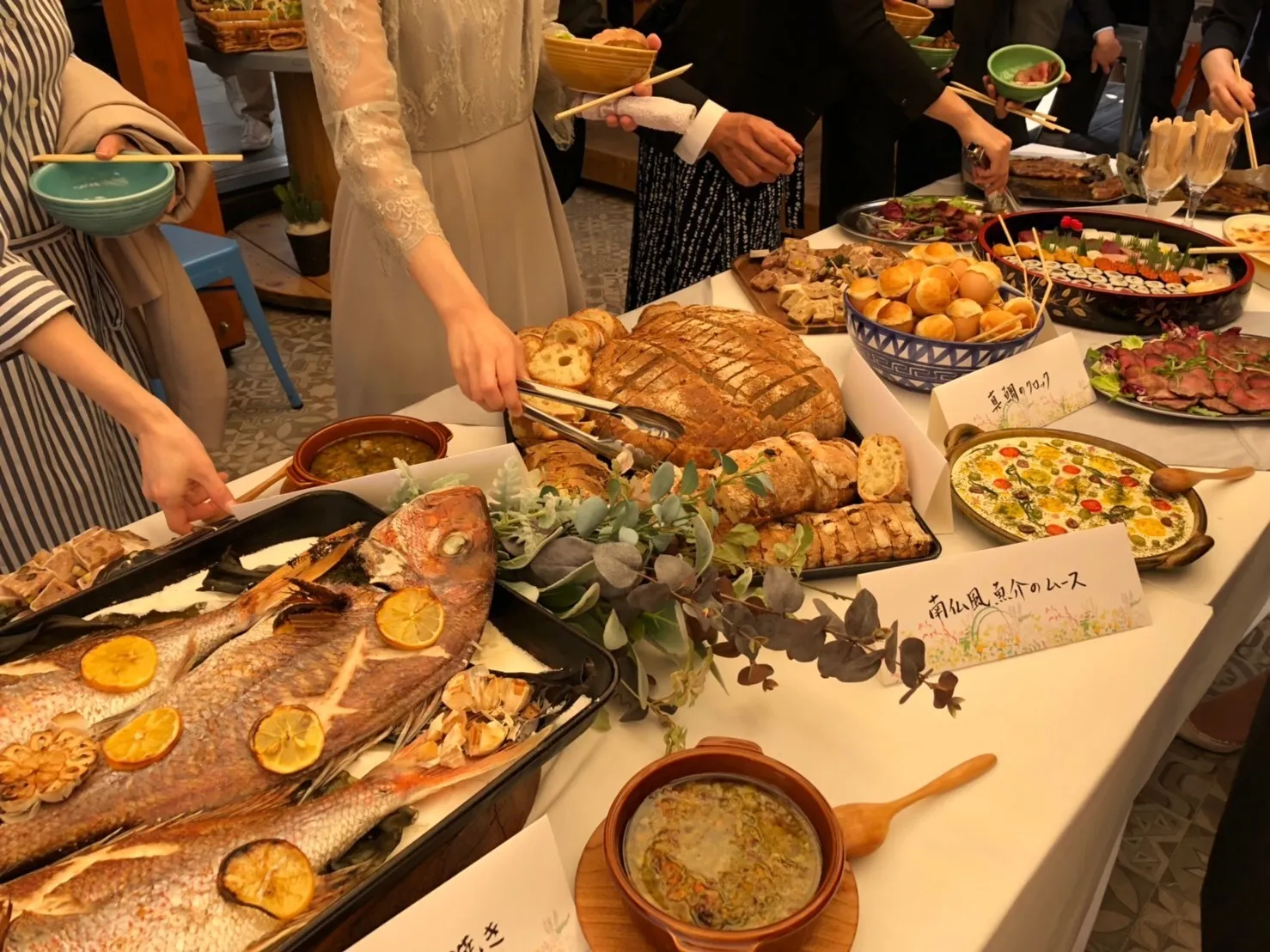 ランチパーティーでは、「宇宙図書艦Hull_Terrace」のご近所でもあるベルソーさんが、必要機材をご持参くださり「大皿ヴュッフェ料理」でおもてなしくださいます。