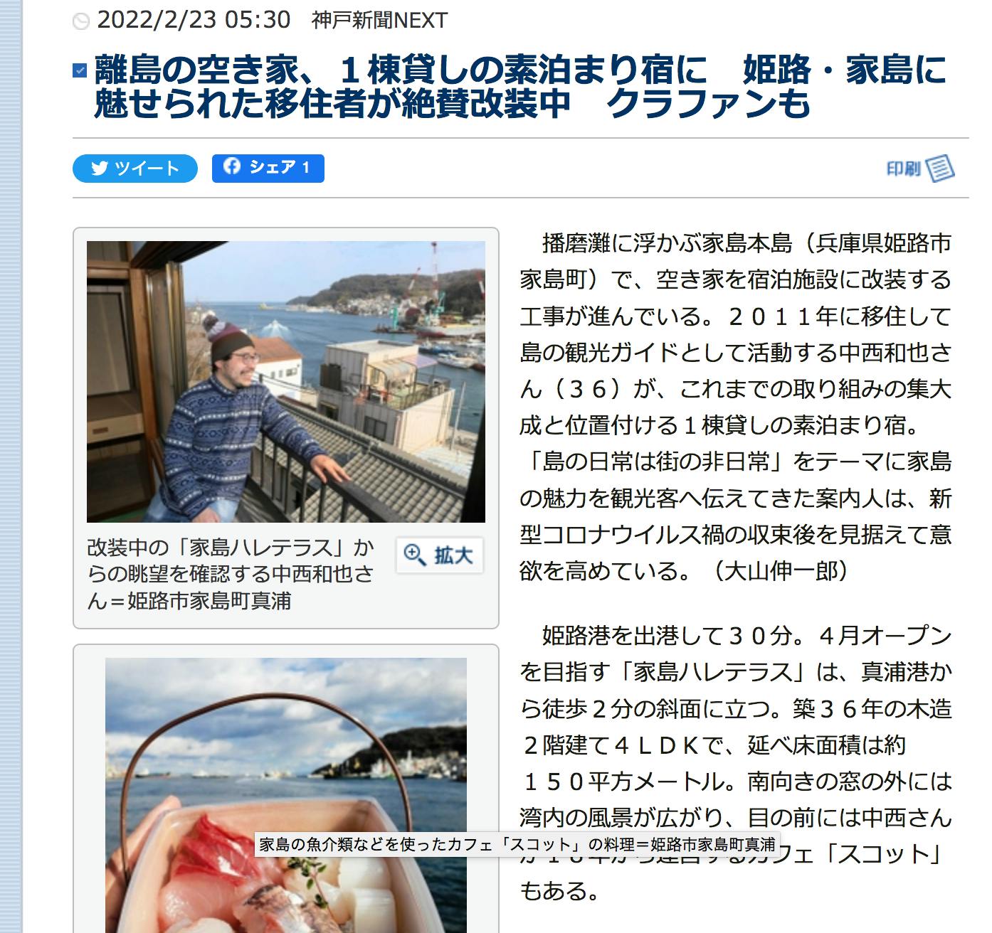 2022/04/21 09:18ご支援いただいたみなさま「家島初の海がみえる1棟貸し宿泊施設「家島ハレテラス」をつくります!!」プロジェクトのいえしまコンシェルジュの中西です。ようやく、保健所の営業許可もおり、この度「家島ハレテラス」をオープンすることができました!宿泊と一緒に体験していただける、面白いプログラムも考えておりますが、それはまた徐々に追加していきます!!ひとまずは、みなさまをお迎えする準備ができましたことをご報告いたします。みなさまからご支援・ご協力をいただき、ここまでくることができました。本当にありがとうございました。(やはり、お金も時間も想定以上にかかりました。。)僕は建築士として、どんな建物が「いい建物か」と常々考えていたのですが、それは『建物に関わった人たちが胸を張って「私がいなければこの建物はなかった」と言える建物』だと今、思っています。そういう意味で、離島という条件不利地域で設計や施工をしてくださった業者の皆様はもちろん、家島の業者さん、家族や従業員、そして、応援していただいた皆様ひとり一人がいなければ成しえなかった建物となりました。本当にありがとうございました。まだ不慣れなことも多く、ちょうどこれから繁忙期に入ることからエアビーのみでボチボチと予約をとらせていただいております。【1日1組限定】瀬戸内海の島にあるゆったり50坪、屋外風呂付きの海がみえる一棟貸し。家島ハレテラスhttps://bit.ly/3v0I5z3今日もガイドの仕事が入っています。一人でも多くの皆様に、家島の暮らしのおもしろさを知ってもらうべく、これからも発信を続けていきます!!今後とも、どうぞよろしくお願いいたします。いえしまコンシェルジュ合同会社 中西和也いえしまコンシェルジュHP:http://ieshimacon.com/海がみえるカフェ スコットInstagram:https://www.instagram.com/cafe_scott/海がみえる1棟貸し宿泊施設「家島ハレテラス」Instagram:https://www.instagram.com/ieshima.hareterrace/ もっと見る
